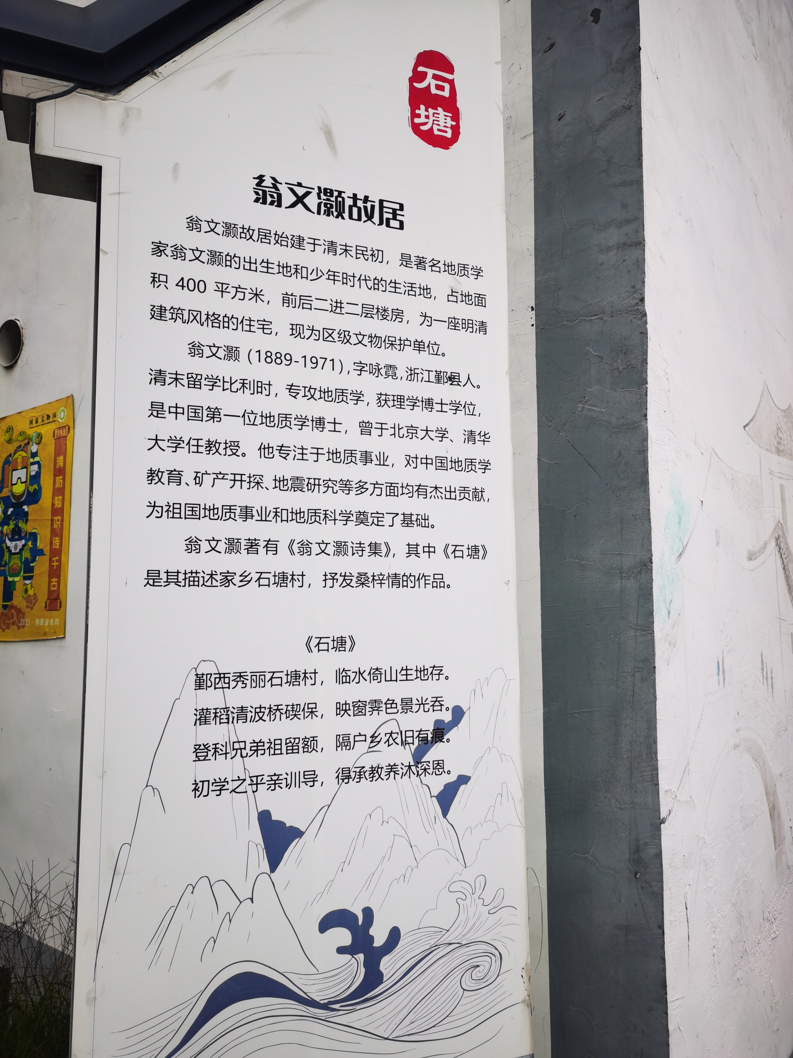高桥,一个很有历史文化的镇,今天来介绍一个名人,翁文灏(1889—1971),字咏霓,宁波市海曙区高桥镇石塘村人,这里是他的出生地与少年生活地。其故居为清末建筑,前后二进二层楼房,前有明堂后有天井,属区级文保单位。他是中国首位地质学博士,被誉为中国地质学奠基人,编绘中国首张彩色地质图,命名“燕山运动”,曾任国民政府行政院院长,学术与政界成就卓著。
