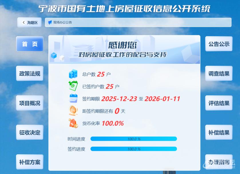 2023年,签约率止步于72%,拆迁被搁置;2024年,有4户最终未签约,拆迁再度被搁置——这个项目,即海曙区三支街配套一路及配套设施房屋征收项目。 1月11日,是该项目第三次征收的签约截止日,据宁波市国有土地上房屋征收信息公开系统显示,其签约率已达到100%! 该项目具体四至范围为:东至空地,南至空地,西至博洋集团(不含),北至河流。即下图红圈中的一整幢楼,其东南面是在建的滨建潮映府、西南面是博洋集团。 项目共涉及被征收总户数25户(含住宅24户、非住宅1户),被征收总面积约1900平方米。 最终签约数据显示,该项目货币化率100%,即所有签约的被征收人都选择“拿钱”,而非“拿安置房”。 根据此前发布的房屋征收补偿方案,被征收住宅预评估比准价格为24130元/平方米,若拆迁后不买房,可以赔到3万元/平方米左右。如果凭房票购买二手房,补偿价为3.25万元/平方米左右;如果凭房票在海曙买新房,补偿价则在3.4万元/平方米左右。