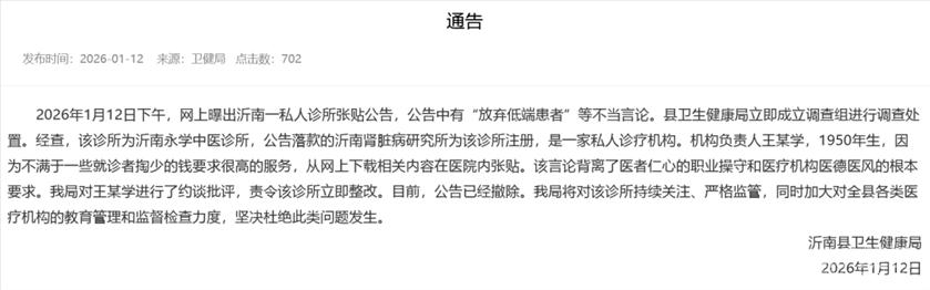 1月12日,山东省临沂市沂南县卫生健康局发布通告: 2026年1月12日下午,网上曝出沂南一私人诊所张贴公告,公告中有“放弃低端患者”等不当言论。县卫生健康局立即成立调查组进行调查处置。 经查,该诊所为沂南永学中医诊所,公告落款的沂南肾脏病研究所为该诊所注册,是一家私人诊疗机构。机构负责人王某学,1950年生,因为不满于一些就诊者掏少的钱要求很高的服务,从网上下载相关内容在医院内张贴。该言论背离了医者仁心的职业操守和医疗机构医德医风的根本要求。我局对王某学进行了约谈批评,责令该诊所立即整改。 目前,公告已经撤除。我局将对该诊所持续关注、严格监管,同时加大对全县各类医疗机构的教育管理和监督检查力度,坚决杜绝此类问题发生。 ![]() ![]() ![]() |