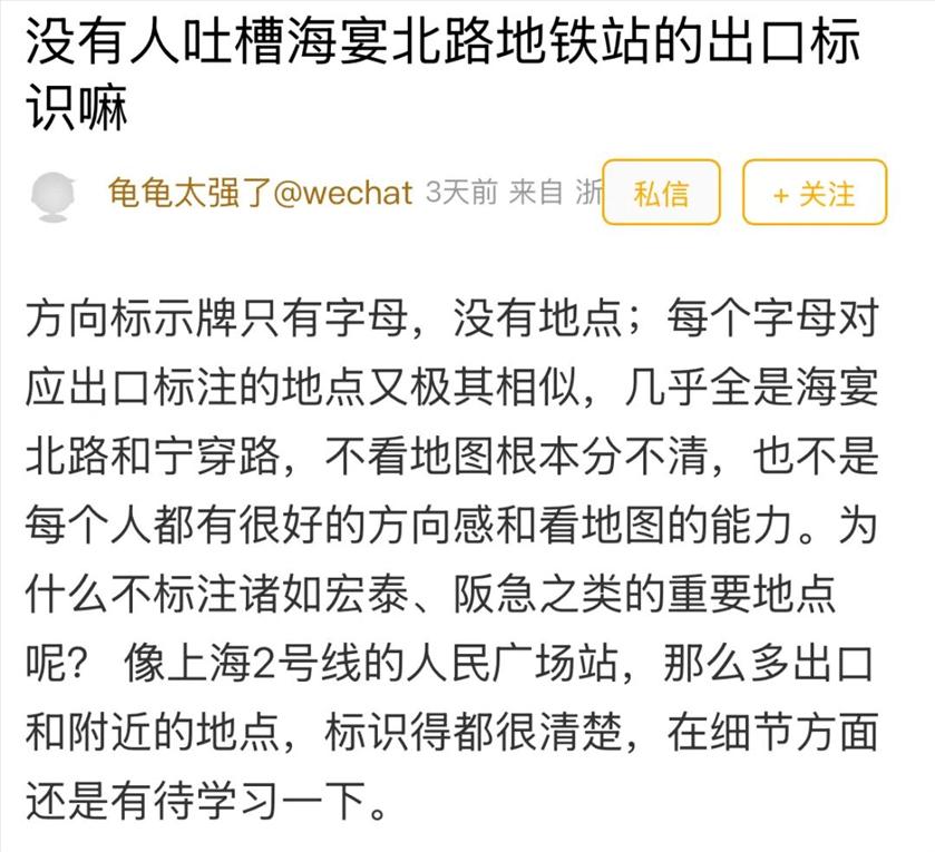 最近,宁波地铁6号线开通的消息刷屏了朋友圈,新线路的开通是件让人开心的事,但不少网友却在吐槽一个“老问题”——海晏北路地铁站的出口标识,依旧让人摸不着头脑。 日前,东论网友“龟龟太强了”发帖吐槽到:海晏北路地铁站的出口标识极其相似,为什么不标注宏泰、阪急之类的重要地点? ![]() ![]() 走进海晏北路地铁站,抬头看出口指示牌,你会发现一个“简洁”到极致的设计:所有出口仅用字母A、B、C、D……标注,没有具体地点名称。更让人崩溃的是,每个字母对应的出口信息里,几乎全是“海晏北路”和“宁穿路”的重复组合。 ![]() 不看手机地图,你根本分不清A口和B口到底通向哪里——是马路这边还是那边?是宏泰广场的正门还是侧门?是阪急百货的入口还是停车场? 而说到地铁出口标识,不得不提上海2号线的人民广场站。作为亚洲最大的地铁站之一,人民广场站有20个出口,但每个出口都清晰标注了附近的地标性建筑,比如“1号口:南京路步行街”“8号口:上海博物馆”。即使第一次来上海的游客,也能根据标识快速找到方向。 反观海晏北路站,明明周边有宏泰广场、阪急百货这样的“流量担当”,却连一个具体地点名称都没标,非得让乘客先记字母、再查地图、最后靠运气“盲选”出口。这种设计,也难怪网友吐槽真的考虑过老年人和方向感差的人群吗? 综合网友的评论,吐槽海晏北路站的出口标识问题早已不是个例,有网友留言称:至少标个东南西北吧! ![]() ![]() ![]() 针对“为什么不标宏泰、阪急”的疑问,有网友反驳:商场可能改名,但路名基本不会变。 ![]() 但问题在于,路名重复率高(比如“海晏北路”和“宁穿路”在多个出口出现),而商场、写字楼等具体地点才是乘客最关心的目的地。 也有网友提出“冠名解决法”:宏泰、阪急要是肯出钱冠名出口,地铁方肯定乐意标。 ![]() 除了出口标识,宁波地铁的站名也被吐槽“太冷门”。比如“大洋江”“小洋江”“曹隘”“柳隘”,连本地人都未必知道具体位置,更别说外地游客了。最绝的是东钱湖站,有网友吐槽:“别说外地人,就算是本地人,出站也愣了好半天,完全分不清方向。” ![]() 还有网友吐槽到,宁波地铁出口为啥非要用英文,标阿拉伯数字不是更清楚明了吗? ![]() 更有网友调侃到:这是怕让大家找到路吧~ ![]() 地铁出口标识看似是小事,却直接关系到乘客的出行体验。尤其是对于老年人、外地游客和方向感差的人群,清晰的标识能减少很多不必要的麻烦。宁波作为新一线城市,地铁建设日新月异,但在细节设计上,或许真的该向上海、广州等城市取取经。 你曾在海晏北路站“迷路”过吗? 欢迎留言讨论 |