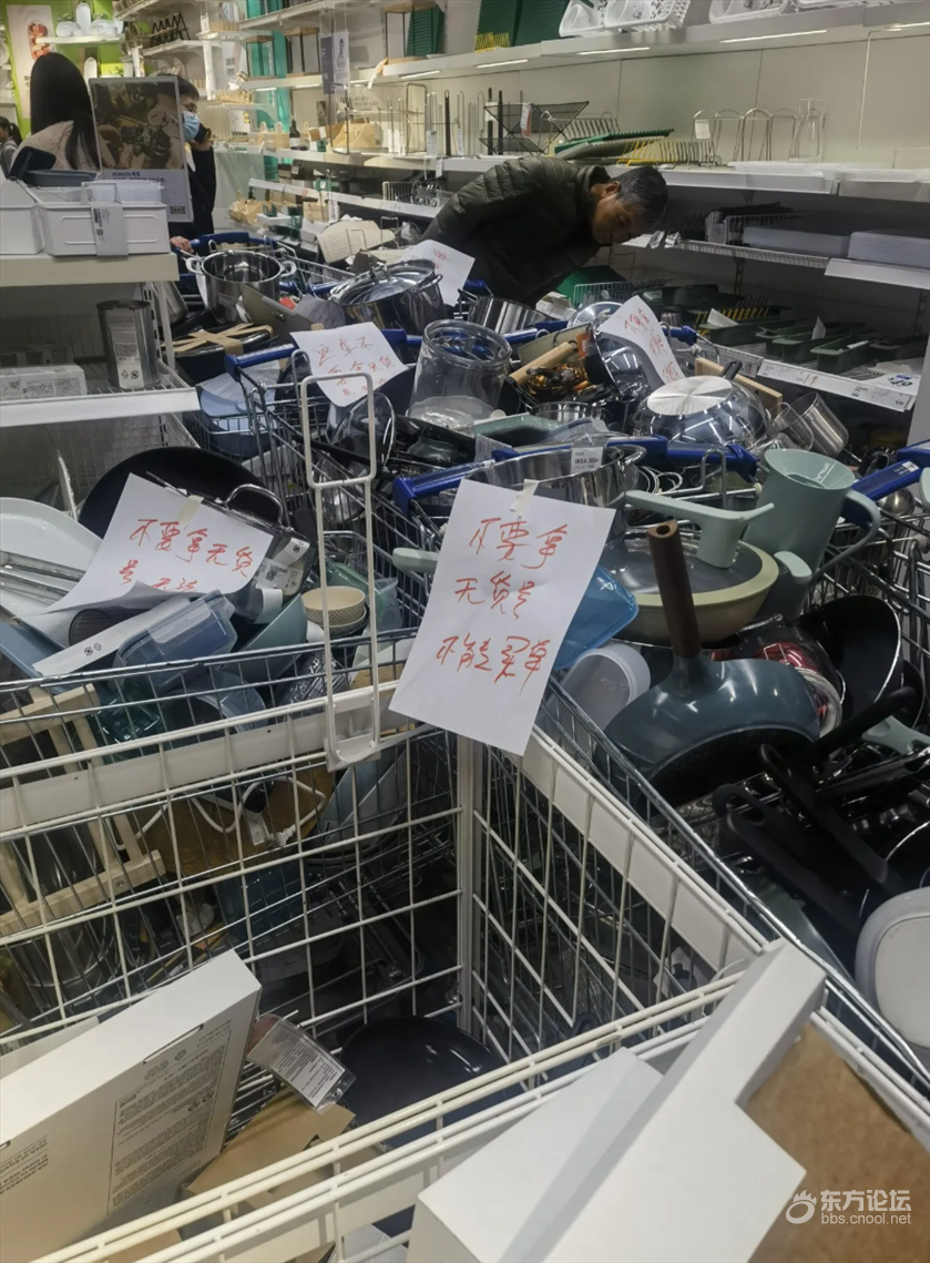 这段时间宜家宁波商场的工作人员估计都要快发疯了,一边是空空如也的货架,一边是堆积如山的杂乱购物车,有等不及排队结账的遗弃的,也有拿了结账的时候后悔导致遗留的。很多产品随手一丢,直接后果就是这个产品不能二次销售,造成大量浪费。