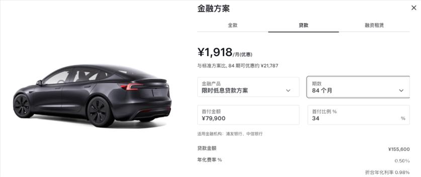 其中,Model 3首付7.99万元起,月供可低至1918元;Model Y首付7.99万元起,月供可低至2263元;Model Y L首付9.99万元起,月供可低至2947元。