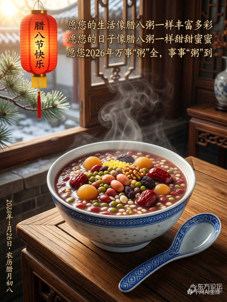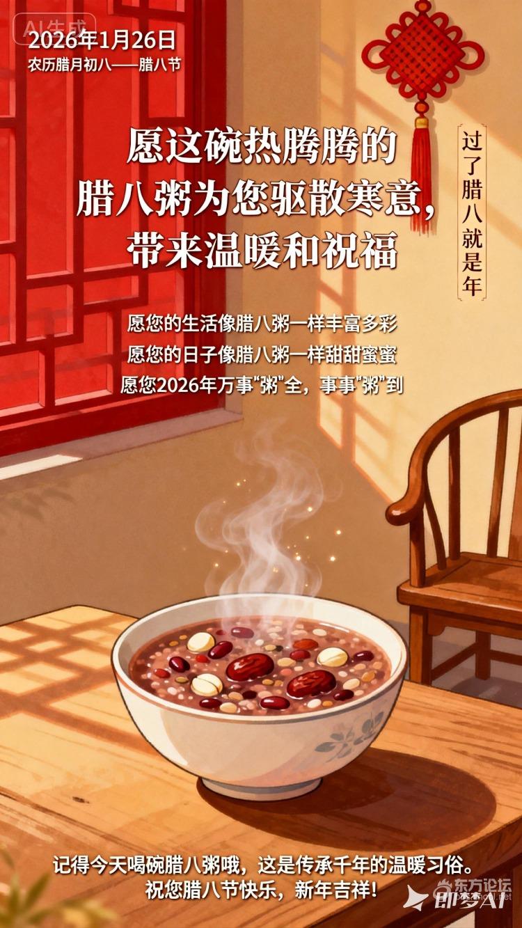 早上好!今天是2026年1月26日,农历腊月初八——腊八节。愿这碗热腾腾的腊八粥为您驱散寒意,带来温暖和祝福。腊八节是中国传统节日,民间有"过了腊八就是年"的说法,意味着春节的序幕已经拉开。在这个特别的日子里,人们会熬制腊八粥,用五谷杂粮熬煮出香甜可口的粥品,象征着五谷丰登、吉祥如意。为您送上温馨的祝福:愿您的生活像腊八粥一样丰富多彩愿您的日子像腊八粥一样甜甜蜜蜜愿您2026年万事"粥"全,事事"粥"到记得今天喝碗腊八粥哦,这是传承千年的温暖习俗。祝您腊八节快乐,新年吉祥!