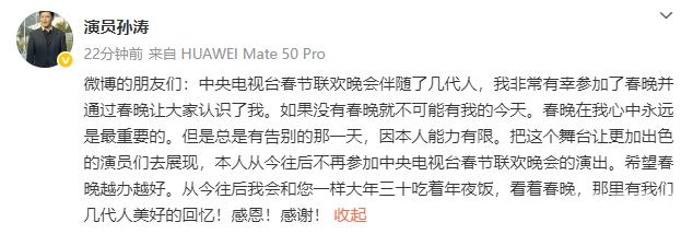 1月26日,@演员孙涛 发文称从今往后不再参加中央电视台春节联欢晚会的演出: 微博的朋友们:中央电视台春节联欢晚会伴随了几代人,我非常有幸参加了春晚并通过春晚让大家认识了我。如果没有春晚就不可能有我的今天。春晚在我心中永远是最重要的。但是总是有告别的那一天,因本人能力有限。把这个舞台让更加出色的演员们去展现,本人从今往后不再参加中央电视台春节联欢晚会的演出。希望春晚越办越好。从今往后我会和您一样大年三十吃着年夜饭,看着春晚,那里有我们几代人美好的回忆!感恩!感谢!