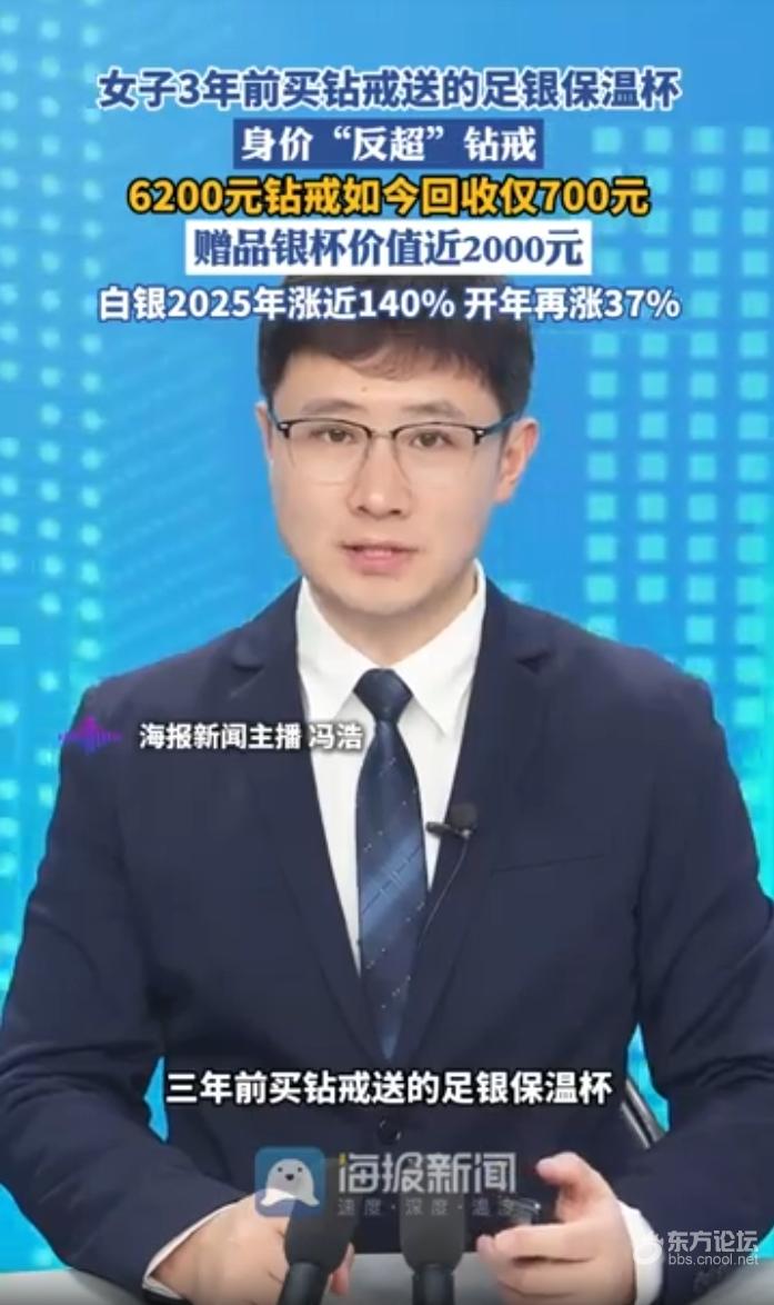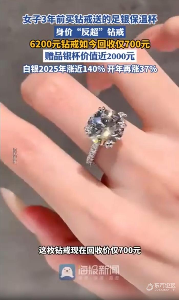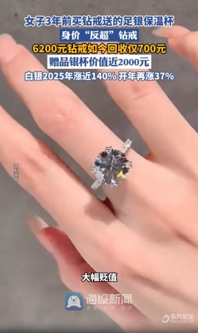 简阳市的王女士收获意外经历:2023年她花费6000余元购入的钻戒,如今回收价仅数百元,而当时商家附赠的足银保温杯,经测算回收价值已近2000元,上演了一出“赠品反超主商品”的奇幻价值反转。2023年,王女士在简阳市本地珠宝店选购钻戒时,恰逢商家推出“消费满额赠足银保温杯”活动,她花费6200元购入一枚钻戒后,免费获赠了一款足银制保温杯。“当时觉得就是个普通赠品,回家后一直放在储物间,连包装都没拆过。”王女士回忆道。近期银价暴涨的新闻让王女士想起了这只闲置的保温杯,她翻出杯子后特意到本地五金店称重,结果显示杯身总重380克,去掉非银质的盖子和滤网后重256克,结合杯身标注的“足银999”标识,她估算纯银内胆重量约70-80克。按照2026年1月23日足银22.5元/克的回收价计算,这只保温杯的纯银回收价值已接近2000元。