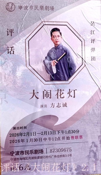 2月1日起,宁波民乐剧场演出苏州评话《大闹花灯》,由吴江评弹团青年海员方志诚担纲出演。小方师傅三十出头,喉咙刮刮响,中气足,吐词清晰,不错。传统书《大闹花灯》是薛仁贵薛刚剧本的其中一段,内容比较丰富,情节也很曲折,各位有空,可到宁波民乐剧场仓桥街3一5号前来一窥,好的话,拿出6元钱,有茶有空调,非常惬意。 ![]() ![]() ![]() ![]() ![]() ![]() ![]() ![]() ![]() ![]() ![]() ![]() ![]() ![]() ![]() ![]()