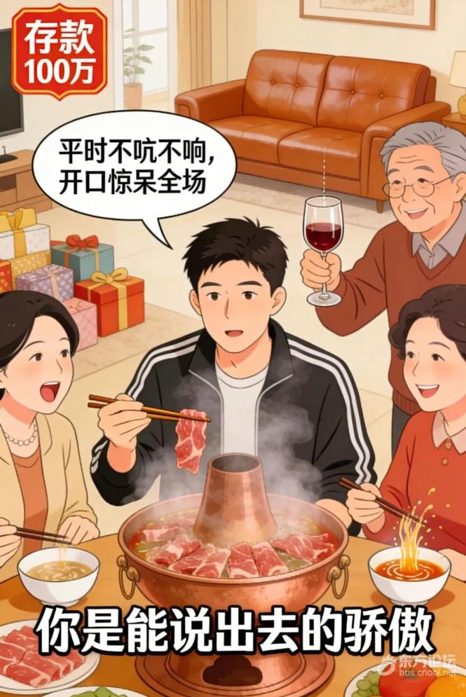 存款是负的——钱是没挣来,还有一屁股债在后面追着,害怕回家过年,怕老爸老妈见了净是失望。 ![]() 存款为0——“空着手回家,礼不礼的......先干活再说“,擦窗户倒垃圾勤快的很,想着爸妈能少唠叨几句。 ![]() 存款10w——“看,混得还行!”,名牌包新手机撑着面子,说话时腰板都挺直了,算是没白忙活一年。 ![]() 存款50w——“家,才是咱最好的”,衣锦还乡听着亲戚邻居唠着嗑夸咱,心里那叫一个美。 ![]() 存款100w——“平时不吭不响的,一开口惊呆了所有人”,你是能被说出去拿得出手的骄傲。 ![]() 存款200w——“真正的有钱,都懒得炫耀”,松弛是账户里的数字给的,咋舒坦咋来。 ![]() 过年回家,存款多少全都写在咱脸上了,太真实了哈...... |