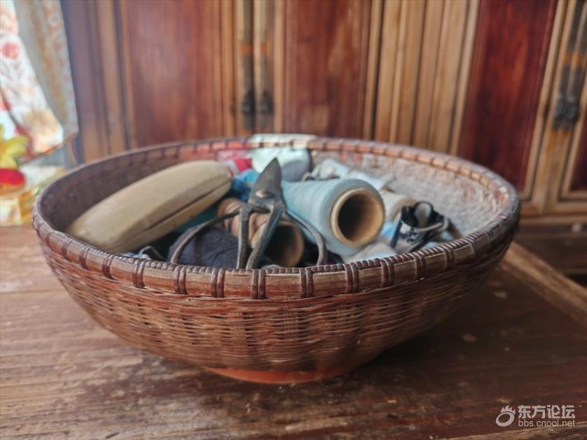 仪式结束后,在老屋的一角,我看到了多年未见的老物件--一个上满灰尘的家箜篮。家箜篮中还有衣被针、几段发黄的纱线圈、一把用来裁布的切刀、一副老花眼、一个套在手指上用来纳鞋底的顶针,一把生锈的铁剪刀,还有几块老布。