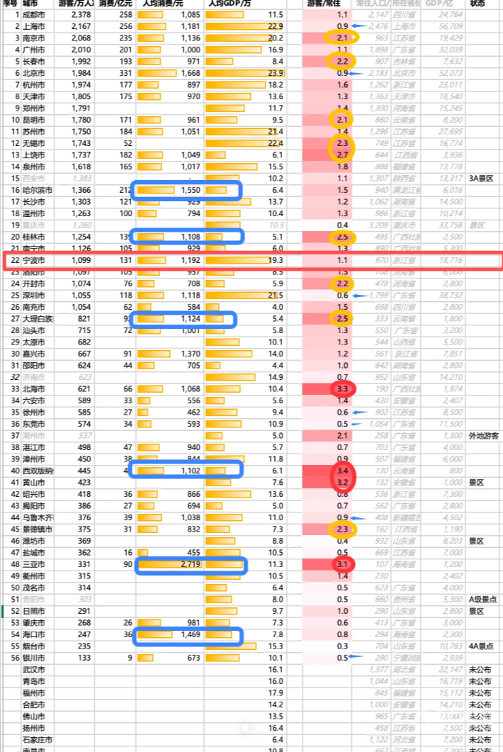 名列前几的城市确实是可以预见的,不过我比较意外我们宁波居然在22名。想想也确实,过年的时候人山人海,自己人随便走到哪里都是看人人人人,鼓楼、外滩这些地方根本不用说了,东钱湖车都快开不进去。网上都说宁波旅游荒漠,这么看根本不是荒漠啊,还是很好玩的,来玩的人也很多,也拉动消费了!