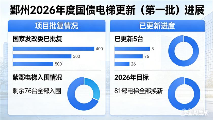 鄞州2026年度国债电梯更新(第一批)获国家发改委已经批复,紫郡剩余76台全部入围,已更新5台,2026年目标,81部电梯全部换新。