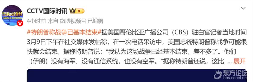 据称,特朗普说:“我认为这场战争已经基本结束,差不多了。他们(伊朗)没有海军,没有通信系统,也没有空军。”据称,特朗普还说,这比他最初预计的4到5周的时间框架“进展快得多”。 ![]() 特朗普称战争会“很快”结束 国际油价涨幅低于他预期 另据央视新闻消息,当地时间9日,美国总统特朗普在佛罗里达州迈阿密市举行的一场新闻发布会上称,美国对伊朗的军事行动会“很快”结束,但“不会”在本周结束。 特朗普还在发布会上提及了对伊朗军事行动的时限、霍尔木兹海峡通航与国际能源安全、伊朗新任最高领袖人选等。 特朗普称,若伊朗影响到全球原油供应,将对其予以更猛烈打击;特朗普还表示,若时机成熟,美国海军将在霍尔木兹海峡护航。 特朗普称,国际油价涨幅低于他的预期,他早在发起对伊行动之前就预料到能源价格会上涨。他表示,他将取消一些与石油相关的制裁,以平抑油价。 伊朗回应特朗普称“战争很快结束”言论 3月10日,伊朗伊斯兰革命卫队10日凌晨回应美国总统特朗普有关伊朗局势的言论时说,战事的结束将由伊朗决定。 伊朗伊斯兰革命卫队发言人说,特朗普试图通过谎言和欺骗对伊朗施加心理压力,“但伊朗以勇气和坚定的意志抵抗美国和以色列的侵略”,“战争的结束将由伊朗决定”。 特朗普称正在调查伊朗小学遇袭事件 再次试图归咎于伊朗 美国总统特朗普9日在一场新闻发布会上称,美国正在调查伊朗南部米纳卜市一所小学遭到空袭的事件。他同时再次试图归咎于伊朗,暗示伊朗也可能有“战斧”巡航导弹。 2月28日,米纳卜市一所小学所在区域遭到美国和以色列空袭。据伊朗媒体报道,这所小学至少165人遇难,其中大部分是女童。据美国《纽约时报》、有线电视新闻网等媒体报道分析,米纳卜市小学遭袭视频中显示的弹药特征与美制“战斧”巡航导弹高度吻合。报道进一步指出,在此次冲突中,美军是唯一使用该型导弹的参战部队。 ![]() |