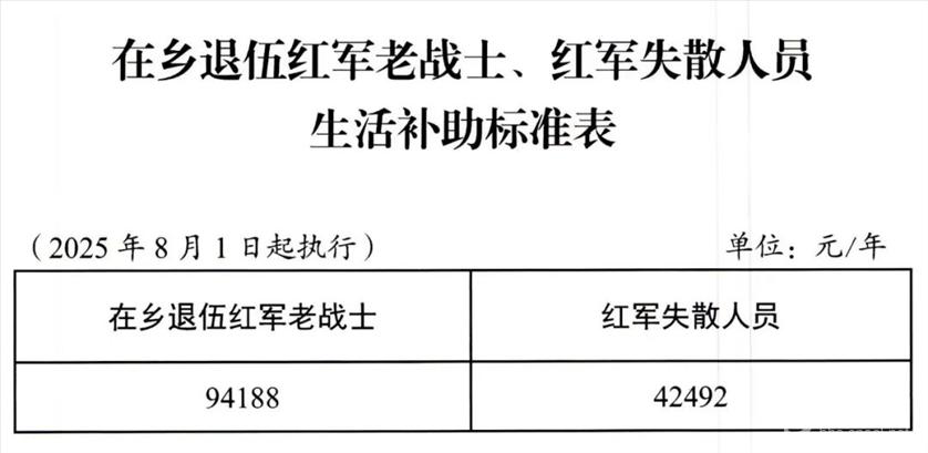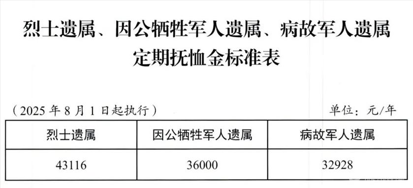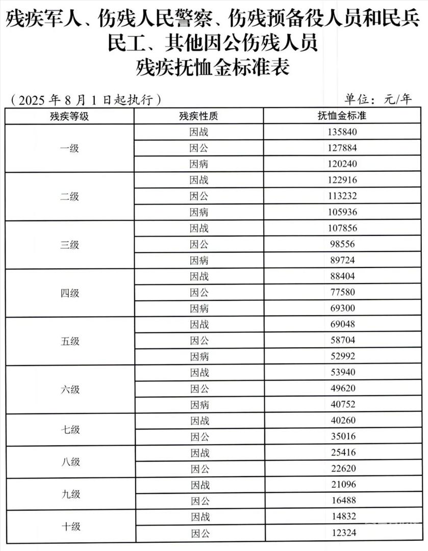 ![]() 有工作单位(含有固定收入)的残疾军人残疾抚恤金,按2025年国家标准执行;无工作单位(含无固定收入)的残疾军人,在当地2024年残疾抚恤金标准基础上,按退役军人事务部、财政部提标标准增加。 烈属、因公牺牲军人遗属、病故军人遗属定期抚恤金,在当地2024年标准基础上,按退役军人事务部、财政部提标标准,每人每年分别提高1260元、1044元、960元。 红军失散人员生活补助,在当地2024年标准基础上,按退役军人事务部、财政部提标标准,每人每年增加1236元。 在乡复员军人生活补助,在当地2024年标准基础上,按退役军人事务部、财政部提标标准,每人每年增加713元。 带病回乡退役军人生活补助,在当地2024年标准基础上,按退役军人事务部、财政部提标标准,每人每年增加300元。 对在农村的和城镇无工作单位且家庭生活困难的参战和参加核试验退役军人(含参与铀矿开采退役军人)生活补助,在2024年标准基础上,按退役军人事务部、财政部提标标准,每人每年增加324元,按每人每年13308元标准发给生活补助。 对居住在农村和城镇无工作单位、18周岁之前没有享受过定期抚恤金待遇且年满60周岁的烈士子女(含新中国成立前错杀后被平反人员的子女)生活补助,在2024年标准基础上,按退役军人事务部、财政部提标标准,每人每年增加264元。 对1954年11月1日试行义务兵役制后至《退役士兵安置条例》施行前入伍、年龄在60周岁以上(含60周岁)、未享受到国家定期抚恤补助的农村籍退役士兵,按每服一年义务兵役每年744元标准发给老年生活补助。 2025年已按照自然增长机制提高优抚对象抚恤补助标准的市、县(市、区),提高部分达到或超过上述标准的不再调整,低于上述标准的,按上述标准补足。 自费参加职工基本养老保险并已领取基本养老金的部分优抚对象的抚恤和生活补助,按国家规定标准执行,具体如下: