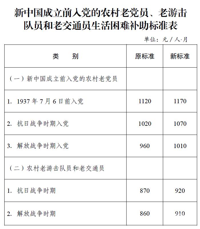 对新中国成立前加入中国共产党的农村老党员和未享受离退休待遇的城镇老党员调整生活补贴标准,月补贴标准调整为: