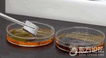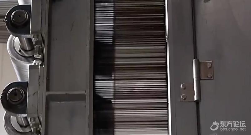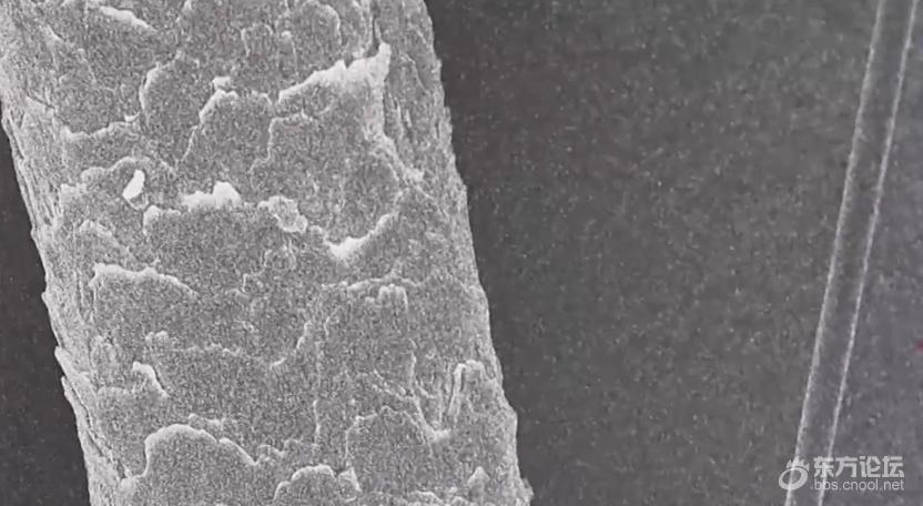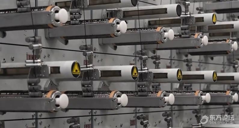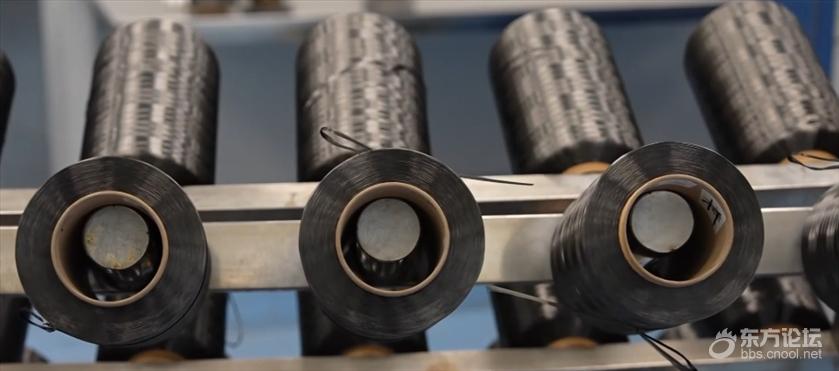 碳纤维在生产过程中经历了近2000℃高温的碳化,化学性能非常稳定。将金属片和碳纤维织片放进主要成分是盐酸和硝酸的王水中,金属片瞬间发生剧烈反应,而碳纤维织片泡了一会儿后都没有任何变化。用喷枪进行火烧测试,碳纤维编织的布料中间已经被烧红,却没有冒烟,更不会被点燃,安全性能非常好。通过电子显微镜放大800倍,对比头发丝和T1200级碳纤维,头发丝表面布满鳞片,直径约67微米,而T1200级碳纤维丝直径还不到4.5微米。△放大800倍的头发丝(左)与T1200级碳纤维(右)。一根由12万根碳纤维丝拧合而成的碳纤维绳,绷紧以后的理论直径还不到2毫米,就可以拉动满载着54个成年人的大货车。T1200级超高强度碳纤维整个生产流程跨越1000多米高温生产线,需要3000多个精密工艺实时精准控制。碳纤维的生产线看起来像一个纺织车间,一排排白色的柱体就是碳纤维的原丝。预氧化在内部温度200℃到300℃之间的氧化炉中进行,最考验火候的把控。就像煎3分熟的牛排,先用温火慢煎,里面既不能太生,表面也不能太焦。它的作用是让原丝更耐热,在后面的高温碳化过程中不会熔断。在十几层的S型往返卷轴上,最先进入氧化炉的原丝从白色开始变得金黄,随着进出氧化炉的次数越来越多,原丝由下往上,颜色变得越来越深。从金黄到深黄,再到棕色,最后变成黑色。接下来就到了无氧碳化环节。低温炉里的温度是600~1000℃,原丝里的非碳物质在这里被基本去除;高温炉里的温度达1000~2000℃,在这里,材料真正完成碳化,成为碳纤维。