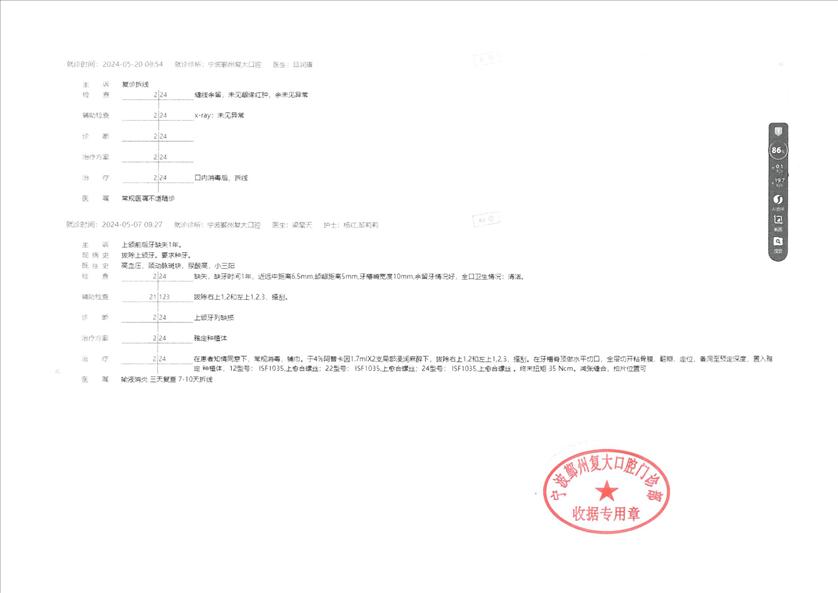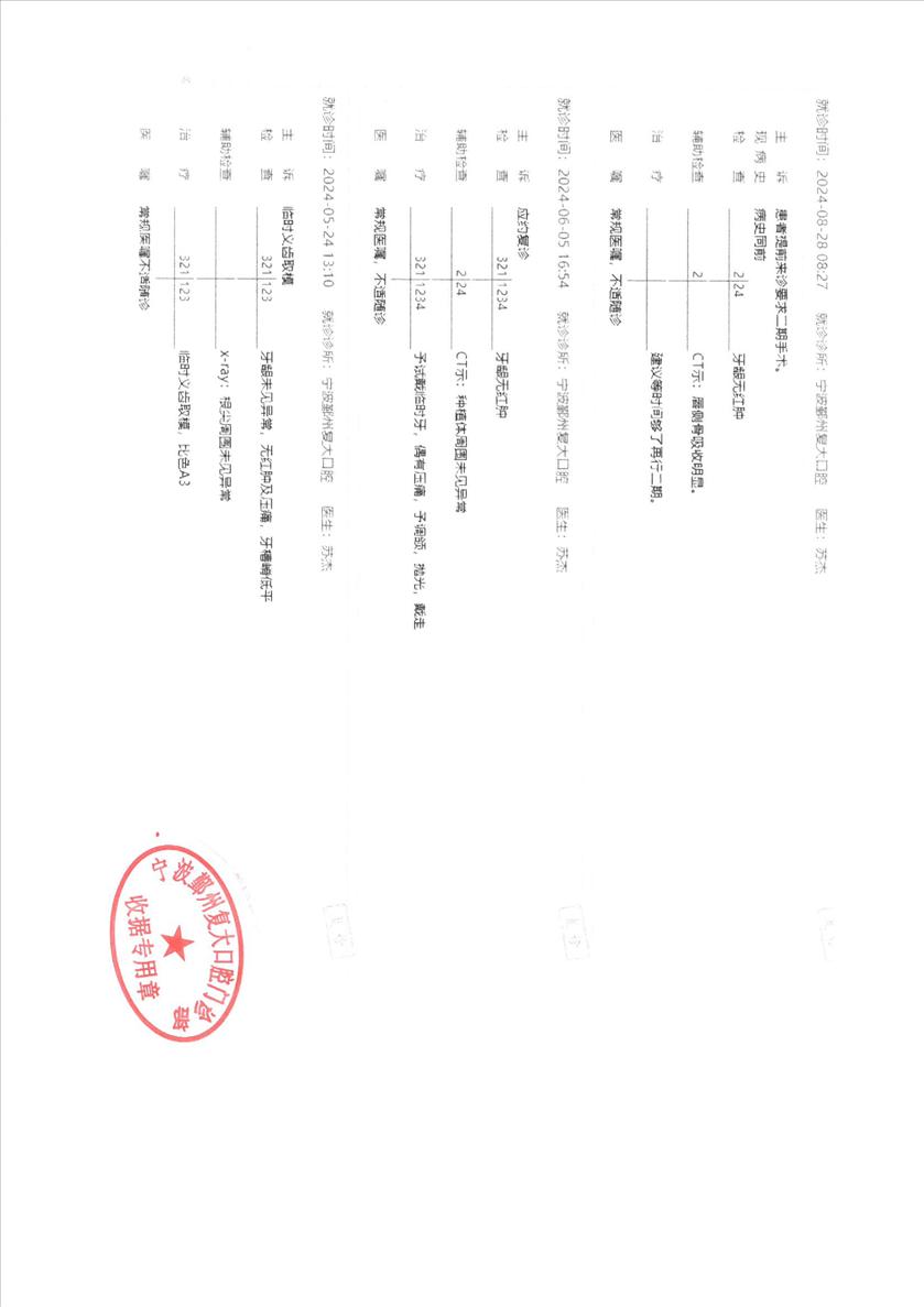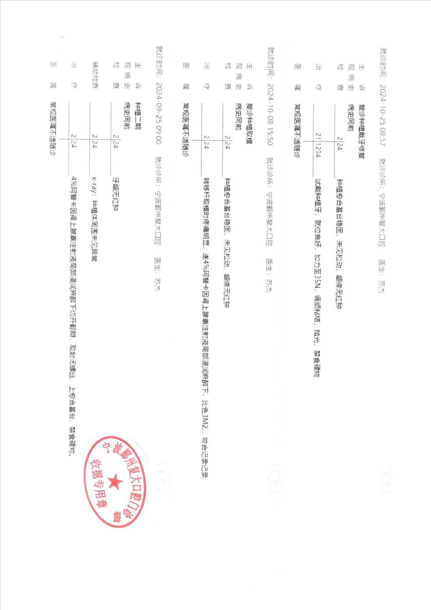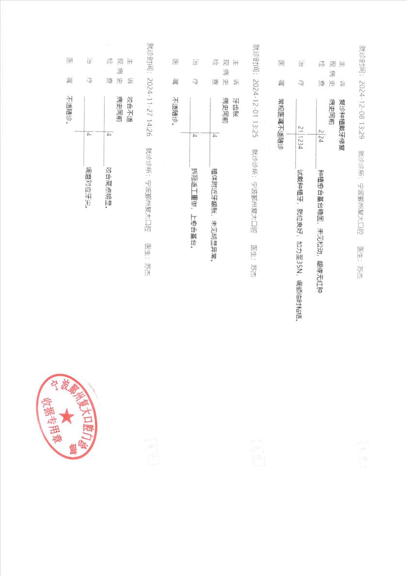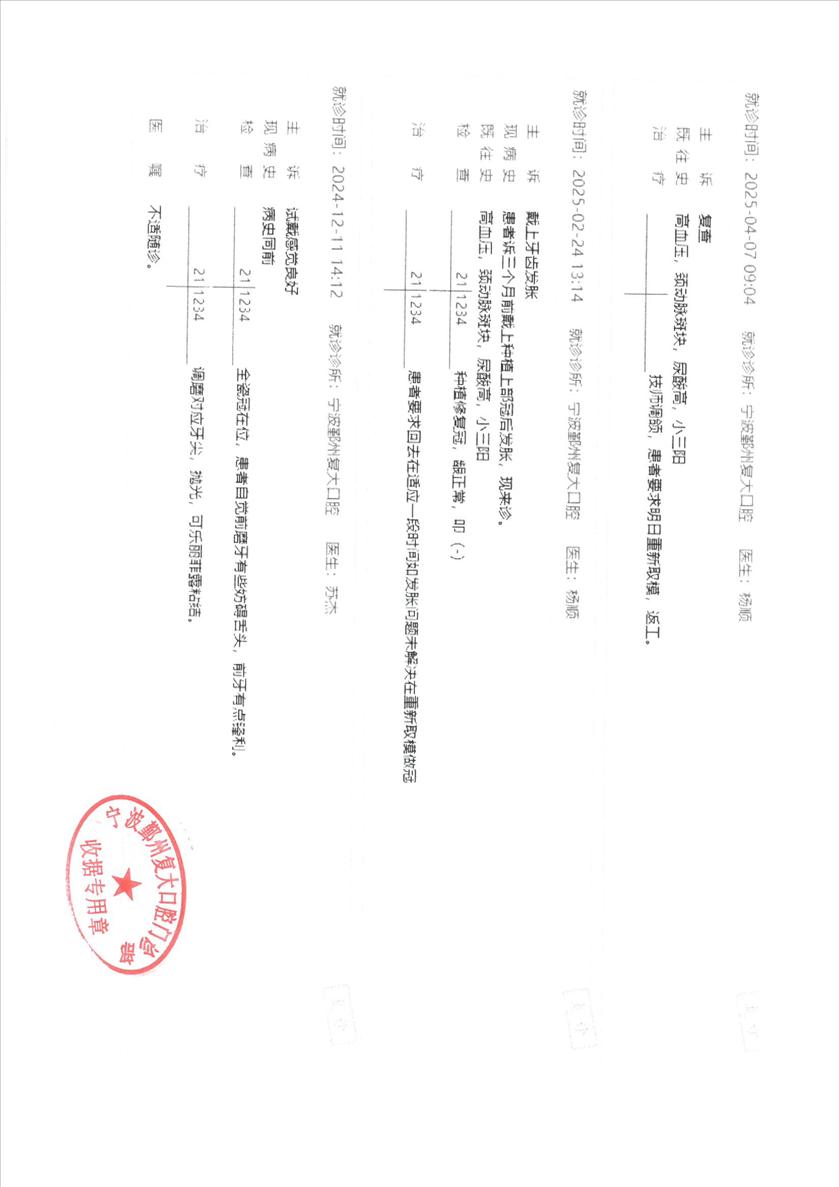 在我市有多家连锁的复大口腔,在宁波的户外有很多广告。我父亲在某个场所遇到了复大的业务人员。他们的就医价格较低,吸引了我父亲,且提供专车接送,还有礼品送。2024年5月7日,我父亲在复大的鄞州分院开始第一次就诊。内容为:三颗上门牙种植,三颗上门牙搭桥。 完成手术后,发觉一颗种植牙有发胀感,影响进食。后经过六次,近两年的返工修理,仍未解决问题。其中有3次返工是医院失误,有定制牙齿方向做错、假牙其他问题、安装问题。还请了个所谓杭州专家。我父亲在其反复的免费治疗下,饱受摧残,仅麻药就多尝试了六次,其中辛酸不一一赘述。 2026年3月2日,我父亲因牙齿胀再次上门就诊,医院的医生却告知可以免费治疗,但却要我父亲签保证书。2026年3月7日,我和父亲同往,向医院院长声明要求返还医疗费用并承担后续由其他医院的治疗费用。院长仅同意其提供免费治疗。我要求其提供治疗记录和CT,并盖章确认。其仅提供极简的治疗记录,且不提供盖章。后发生争执,并报警。在钟公庙派出所的协调下,其在就诊记录上,盖了“宁波鄞州复大口腔门诊部收据专用章”。 仅在该天,我就发现有类似的病友,已反复返工治疗六次的70来岁的大妈。仍然痛苦着的病患不单单是我父亲一个。一个营销一流的医院,若不在技术下功夫,比那默默无闻的技术差的医院,社会的危害性会更大,会有更多的受害者。 恳请相关领导和部门,对重营销轻技术的牙科医院予以整顿;同时恳请对仍在痛苦的患者给予支持,协调和处理本事件!谢谢!