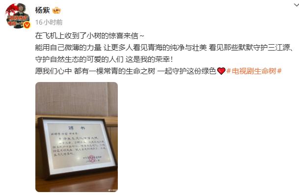 同日晚间,演员杨紫发布微博称,已获聘“青海生态文化传播大使”,并表示:“能用自己微薄的力量,让更多人看见青海的纯净与壮美,看见那些默默守护三江源、守护自然生态的可爱的人们,这是我的荣幸!”