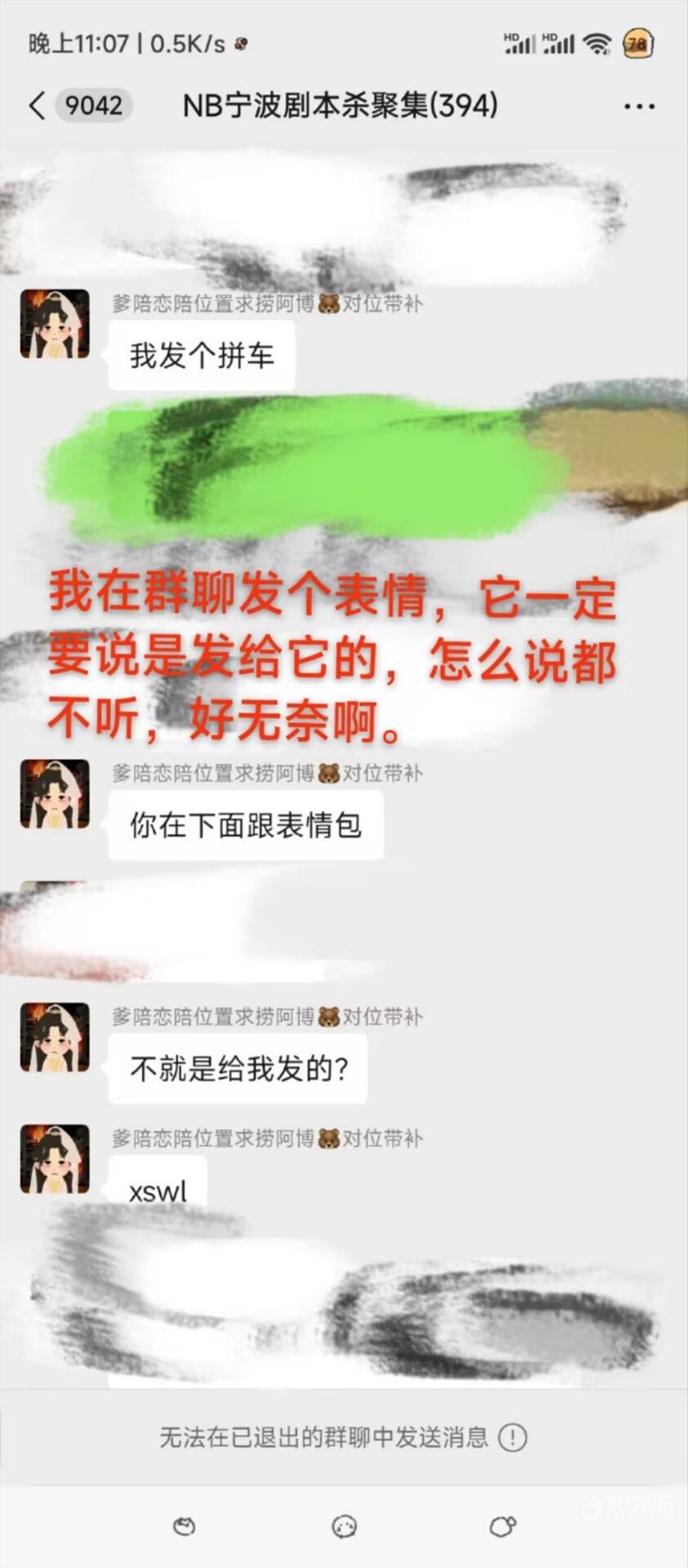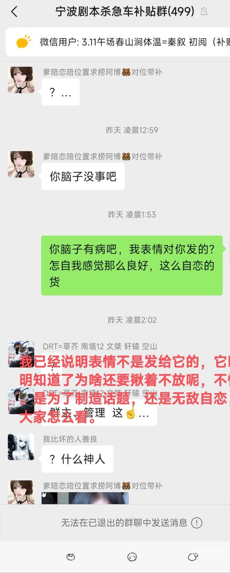 一个几百人大群里,大家都在聊天,有个群员随手发了个表情,然后一个女的非要说这个表情是发给它的,群员没搭理它,它就直接开骂了,群员说不是发给它的,让它不要那么自作多情,它非要说是发给它的,不管怎么说就是不听,然后到处发小作文污蔑有人性骚扰它。这是什么精神病的病状? ![]() ![]() ![]() ![]() ![]() ![]() ![]() ![]() 这是群聊,不是私聊,大家都在聊天。群员也没有艾特它,只是恰好发在了它后面,而且也马上否认是发给它的,它为啥就是不听呢,然后歪曲事实写小作文到处散播。 |