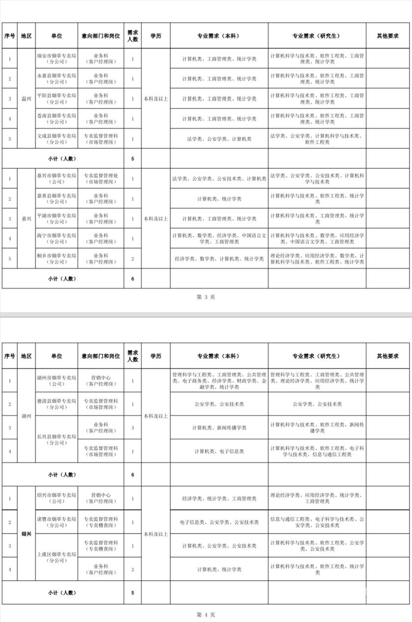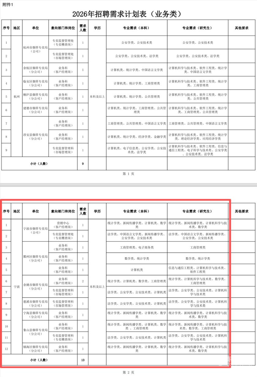 因工作需要,浙江省烟草专卖局(公司)计划开展2026年度全省系统业务类岗位公开招聘。现将有关事项公告如下: 1 招聘岗位 本次共计招聘63人,具体招聘单位、岗位及相关要求,详见《2026年招聘计划表(业务类)》(附件1)。 2 招聘对象 (一)2026年全国普通高等院校统分统招,于2025年8月1日至2026年7月31日期间毕业的应届毕业生(以毕业证、学位证签署时间为准)。 (二)2025年8月1日至2026年7月31日期间毕业且获得教育部留学服务中心学历、学位认证的国(境)外院校毕业生(以毕业证、学位证签署时间为准)。 3 报考条件 (一)应聘者应当具备下列资格条件: 1.拥护中华人民共和国宪法,拥护中国共产党领导和社会主义制度; 2.具有良好的政治素质和道德品行; 3.具有正常履行职责的身体条件和心理素质; 4.具有符合拟任岗位所要求的学历、专业和工作能力; 5.具有符合拟任岗位所要求的其他资格条件; 6.年龄一般为28周岁以下(1998年1月1日及以后出生),硕士及以上学历人员年龄放宽至30周岁以下(1996年1月1日及以后出生)。 (二)下列人员不得参加应聘: 1.因犯罪受过刑事处罚的; 2.被开除中国共产党党籍的; 3.受过开除处分的; 4.被依法列为失信联合惩戒对象的; 5.有其他不适宜招录的违法情形。 ![]() ![]() ![]() 4 报考程序 (一)报名 1.报名流程:应聘者登录浙江烟草外网(),点击“人才招聘”栏目进入人才招聘系统,注册登录,录入个人信息,签署《诚信报考承诺书(必填)》(附件2)上传至个人简历的其他材料后,报考相应岗位。 应聘者下载求职应聘表,按招聘公告内校园招聘会行程安排(附件3),就近选择高校,自行前往校园招聘会现场进行初次面试;无法进行现场初次面试的,在规定时间内,向报考单位申请开展视频初次面试或自行前往报考单位进行现场初次面试(附件4)。未经所报单位初次面试的,网上报名无效。 网上报名和申请视频初次面试的截止时间为2026年3月27日17:00(逾期系统将自动关闭)。前往报考单位进行现场初次面试及视频初次面试的时间为2026年3月30日至4月3日(工作日8:30-11:30、14:00-17:00),逾期将不再受理。 2.报名要求:应聘者应以已(将)获得的最高学历、学位证书所对应的专业报考。报考岗位专业参照《2025年公务员招考专业参考目录》(附件5)。国(境)外院校毕业的应聘者所学学科专业与资格条件要求的学科专业相近但不在选定参考目录的,在所学专业栏中勾选其他,并选择专业目录,填写具体专业名称。 应聘者须如实、完整、准确、规范填写报考信息,包括家庭情况、亲属在烟草行业就业情况、教育经历、工作经历/实践、获奖情况及惩处信息等。在同一招聘公告中,只能选择一个招聘岗位进行报名。应聘者只填写个人简历、未选择相应岗位报考的,报名无效。 (二)资格审查 根据资格初审、初次面试和资格复核情况,择优确定入围笔试人员名单。若入围人数低于招聘岗位数1:3比例的,核减该岗位招聘计划。 (三)笔试 笔试统一组织实施,考试科目为综合基础知识。笔试时间、地点由报考单位另行通知。根据试卷难易程度,视情确定笔试合格分数线,未达到合格分数线的不进入面试环节。 (四)面试 1.根据笔试成绩,按照招聘岗位数1:3的比例确定参加面试人员名单,可入围笔试成绩末位出现并列的,并列人员全部进入面试人选范围。若笔试合格人数低于1:3,不低于1:2的,按照实际合格人数进入面试;若低于1:2,则核减该岗位招聘计划。因应聘者放弃面试资格产生面试名额空缺的,将在规定时间内,在笔试成绩合格人员当中按笔试成绩从高到低依次递补。 2.面试前进行现场资格复审,国内院校毕业生资格复审材料包括:本人有效居民身份证、学历学位证书或学信网学籍验证报告、就业推荐表原件,以及招聘岗位资格审查所需的其他材料。国(境)外院校毕业生资格复审材料包括:本人有效居民身份证、学历学位证书、教育部留学服务中心学历学位认证书等材料原件,以及招聘岗位资格审查所需的其他材料。资格复审时尚未取得相关材料的,应聘者作出书面承诺后,可进行面试。应聘者未按要求参加面试前现场资格复审的,视作放弃面试,面试人员不再递补。 3.面试将采用结构化面试的方式进行,总分为100分,合格分数线为60分。面试未达到合格标准者,不列入考察与体检的对象范围。 (五)成绩排名 1.成绩计算 综合成绩=笔试成绩×50%+面试成绩×50% 2.成绩排名 按照综合成绩从高到低进行排序,综合成绩相同的,按照面试成绩排名,若笔试面试成绩均相同的,将再安排一轮面试,根据新一轮面试成绩确定人选。 (六)考察与体检 根据应聘者综合成绩,按照招聘岗位数1:1比例确定考察与体检对象。 1.考察内容主要包括人选的政治素质、道德品行、能力素质、心理素质、学习和工作表现、遵纪守法、廉洁自律、岗位匹配度以及是否需要回避等方面的情况。考察人选达不到规定的资格条件或者不符合报考岗位要求的,不得确定为拟录用人员。 2.体检标准参照《公务员录用体检通用标准(试行)》等有关规定执行。其中,报考情报分析岗、市场管理岗、专卖稽查岗,具有以下情形之一的,视为体检不合格:(1)色盲;(2)色弱;(3)听力障碍;(4)肢体功能障碍;(5)其他经指定医疗机构鉴定认为不适合卷烟鉴别、烟草专卖行政执法的情况。招聘单位或应聘者对体检结果有异议的,可以提出复检。复检要求应在接到体检结论通