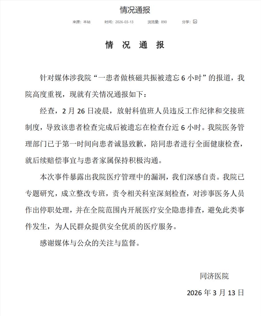 3月13日,同济医院发布情况通报:![]() 据媒体此前报道,因颈部疼痛,唐先生预约了华中科技大学同济医学院附属同济医院的核磁共振检查。 2月25日晚10时许,他来到医院汉口院区17栋1楼叫号。2月26日凌晨0时许,他躺在2号检查室核磁共振机器上,其手机放在检查室窗台边桌上,医生固定了其头部,脸部罩有面罩。半小时后,他喊道:怎么还没做完,无人应答,断断续续喊了6小时,直到清晨才被保洁员发现而脱困。 3月12日,涉事医生称,她把唐先生“绑”在机器上后,因其他工作急着做,便离开了。离开之前,她在系统上记下唐先生检查已完成,并告诉同事唐先生还在机器上。没想到,同事忘了检查机器上还有没有人。 |