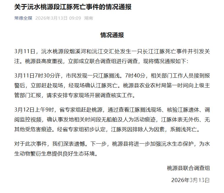 3月13日,常德市桃源县联合调查组发布通报介绍,3月11日7时30分许,市民发现一只江豚搁浅。7时40分,相关部门工作人员接到报警后,立即赶赴现场,经现场确认江豚死亡。桃源县农业农村局第一时间向上级主管部门汇报,请求安排专家现场开展调查核实工作。3月12日上午9时,省专家组赶赴桃源,通过查看江豚搁浅现场、核验江豚遗体、调阅监控视频,确认事发地相关时间段无船舶及人为活动痕迹,江豚体表无外伤、无其他受危害痕迹。经省专家组初步认定,江豚死因排除人为因素,系搁浅死亡。下一步,桃源县将进一步加强沅水生态保护,为水生动物繁衍生息提供良好生态环境。 ![]() 13日,桃源县农业农村局工作人员告诉极目新闻记者,目前这次死亡的江豚遗体已运往专业研究机构,进行解剖,进一步调查其详细的死亡原因。 据公开资料,长江江豚是我国特有的淡水鲸类动物,是国家一级保护野生动物,被誉为“水中大熊猫”。据三湘都市报报道,2026年2月,沅江水域曾出现成群江豚逐浪觅食。 |