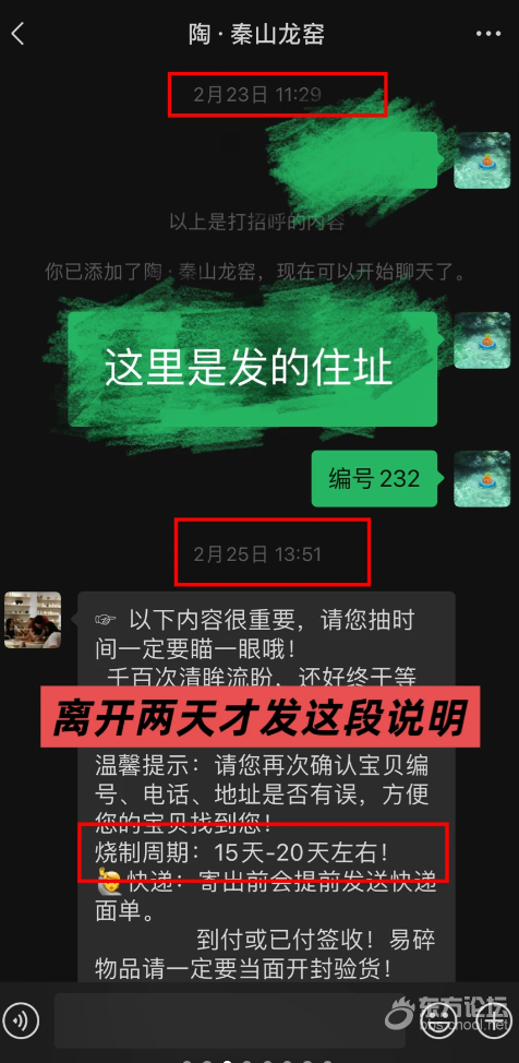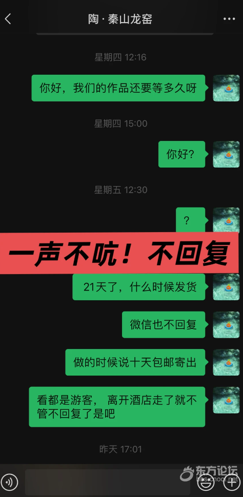2月23日大年初七带孩子去宁波九龙湖开元酒店,在大堂右手边陶艺吧付了188做了一个花瓶,加了微信时说10天左右寄出。回家第二天2.25日发来微信又说15-20天才能寄出。出于信任,从2.23做完到3.12日,17天后我才第一次询问,然后发现微信根本无人回复。于是酒店管家,陶艺方回复他们说微信会回复我,实际上并没有! 管家给我提供了陶艺方的联系方式,我在3.13拨打电话联系后,老板说会回复微信,还是没有回复! 3.13打完电话没消息了,3.16通过前面管家给的联系方式添加所谓老板的微信,终于是回了,3.18收到,还是个坏的,联系店家微信,又不回复了。 真是遇到难回答的问题你又不说话了! 差一点我这188就白瞎了,钱不多,但是很恶心人