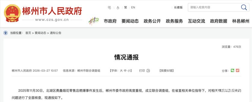 3月27日,湖南省郴州市人民政府网站发布情况通报: