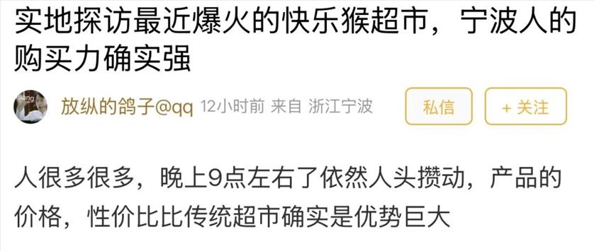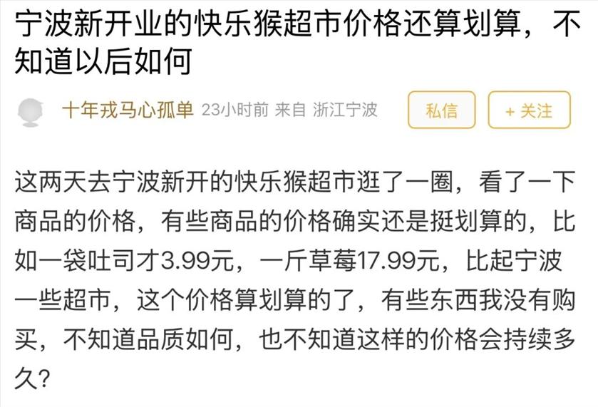 3月27日,快乐猴超市宁波鄞州区店和镇海区招宝广场店两店同时开业了。作为美团旗下的硬折扣社区超市品牌,快乐猴从筹备之初便备受关注。 那么,几天过去,超市的经营情况如何呢? 东论网友@十年戎马心孤单发帖爆料,认可了该折扣超市的价格: ![]() 从网友拍摄的图片中可以看到,一袋全麦吐司3.99元,一盒蛋挞5.99元,一斤草莓17.99元。相较于面包店动辄十几二十的蛋挞价格来说,确实是比较有性价比的。 ![]() ![]() ![]() 而在此番低价优势之下,快乐猴的生意自然也相对火爆。东论网友@放纵的鸽子实地探访,晚上9点左右,超市的货架基本都已经空了: ![]() 可以看到,各个品类货架的商品都已所剩无几,足见生意确实不错。 ![]() ![]() ![]() 据了解,以“社区超市”为定位的“快乐猴”,聚焦家庭一日三餐的需求。鄞州门店精选了1600余个SKU(商品品类),涵盖生鲜果蔬、肉禽蛋、米面粮油、烘焙熟食、速冻食品、零食酒饮及家居日用等多个品类。 而除了目前开业的两家店之外,快乐猴超市之后还会在宁波启幕更多门店。 ![]() 门店分布多,商品种类多,如果能如同现在一般发展下去,快乐猴也许会成为市民日常采买的一个新选择。 那么,网友们目前对这家新超市的态度如何呢? 有一部分网友觉得很不错,商家越内卷,推出的价格越实惠,对消费者来说就越好。 ![]() ![]() 但大部分网友却有着相对“消极”的看法,主要还是围绕着价格、品类等。 ![]() ![]() ![]() ![]() 其实对于消费者而言,真正能被我们所认可的品牌,一定是在性价比上有竞争力的,正如大家所提名的盒马NB一样。 如果快乐猴能一直保持住低价和商品的质量,相信也自然会迎来他的固定客群吧。 你会去这家超市看看吗? 欢迎留言讨论 |