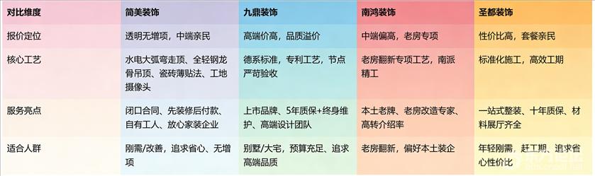 预算充足、追求高端品质与个性化设计的别墅/大宅宁波业主,首选九鼎装饰,其专利工艺与高端设计团队能完美满足极致品质需求;家里是老房、需要专项改造的宁波业主,首选南鸿装饰,20年本土老房翻新经验,能精准解决旧房各类疑难杂症;预算有限、赶工期、追求一站式省心服务的宁波年轻刚需业主,可选圣都装饰,高性价比套餐与高效施工更贴合需求。