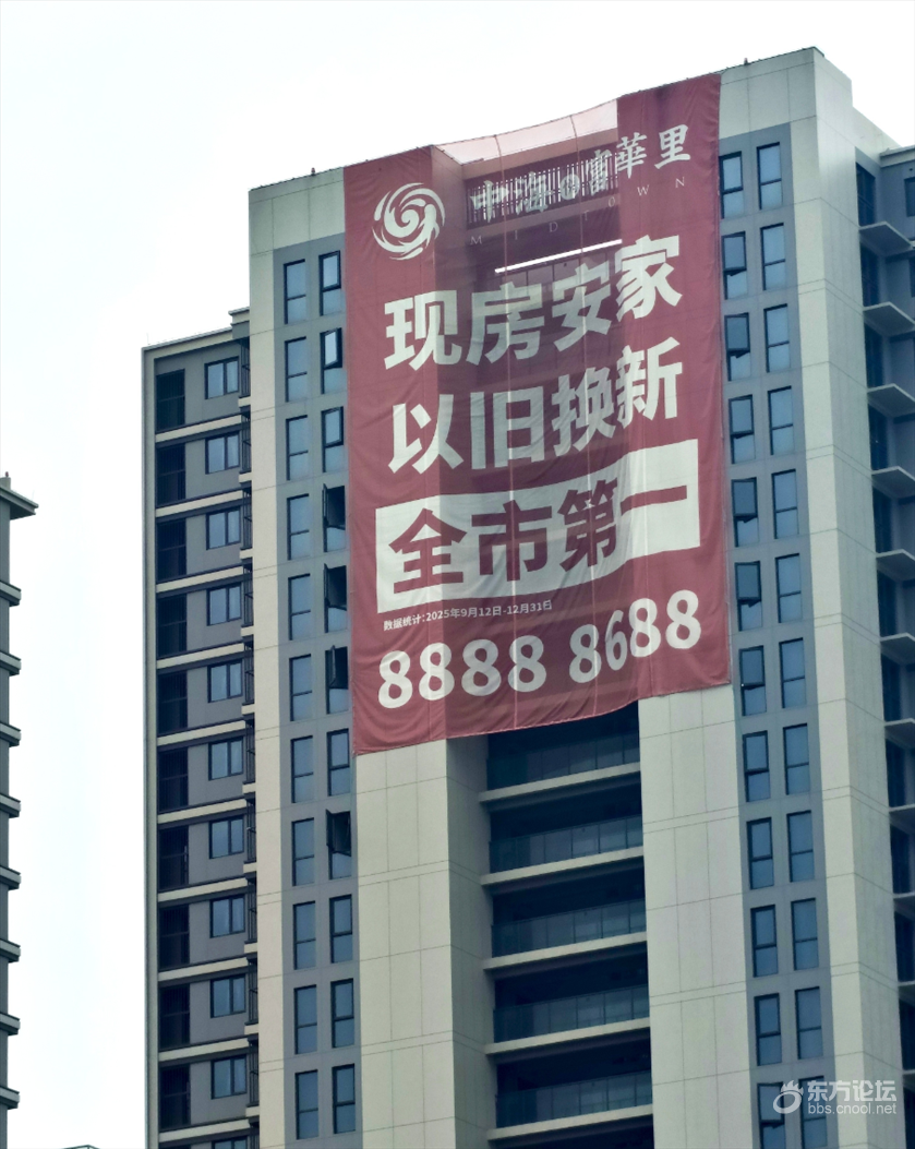 路过宁波江北大道洋市河边上,看到开发商在高楼上挂了巨幅标语:“现房安家,以旧换新”,还特别标注"全市第一"。 现在开发商房子卖不动急得跳脚。这次宁波推出以旧换新政策,开发商可算抓到救命稻草了,标语挂得高高,使劲吆喝。 这楼盘位置确实不错,地铁4号线和8号线都在旁边六七百米距离。当年开盘精装修要27000一平,去年交付时还有一堆没卖掉,降价促销都卖不动。 现在据说降到22500左右,但能不能卖出去还真不好说。有人告诉我,这楼盘没住过人的新房,二手房市场只卖18000。 只能说开发商不容易,购房者也不容易,且买且珍惜吧。