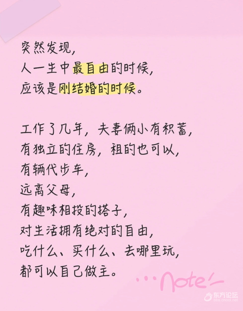 突然发现, 人一生中最自由的时候, 应该是刚结婚的时候。 工作了几年,夫妻俩小有积蓄, 有独立的住房,租的也可以, 有辆代步车, 远离父母, 有趣味相投的搭子, 对生活拥有绝对的自由, 吃什么、买什么、去哪里玩, 都可以自己做主。 然而, 这样美好的时期太短暂了。 “最佳生育年龄”像一道无形的倒计时, 于是顺理成章地,孩子来了。 然后生活彻底变了样。 二人世界,一下子变成两代同堂。 虽然大家都是通情达理的人, 但生活习惯、思想观念的差异, 落到日常细节里, 全都变成了对自由的隐形束缚。 好不容易从父母那里独立出来, 却因为要照顾孩子, 又不得不回头依赖他们。 一边感恩,一边被束缚。 两种感受同时存在, 哪个都不是假的。 说后悔吗?也不是。 只是偶尔会想起那几年, 两个人说走就走的自由!