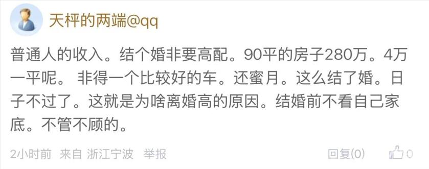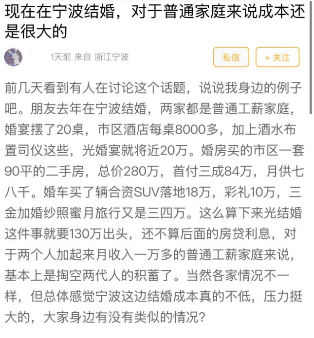 最近,一个宁波结婚成本高的话题,在论坛里引起了热议。 有网友发帖表示,身边有一对新人结婚,两边都是普通工薪家庭,最后一拉账单,发现几乎把两代人的积蓄掏空了: ![]() 根据网友的描述,我们来算一笔账: ♥ 婚房:280万 婚宴:20万 车子:18万 彩礼:10万 蜜月旅行:4万 总价:332万 当然,房价的一部分会在日后以贷款形式偿还,但加上利息一类的,对小夫妻相加过万的工资来说,还是颇有压力。 其实细看账单明细,这场婚礼的举办也没有特别铺张浪费的地方,算是“基本选项”。 ![]() 图片由微信AI生成 也有网友看到后,表示很能共情,对于很多普通家庭来说,负担确实大。 ![]() 不过,虽然结婚成本高是不争的事实,但也有网友在细看账单之后表示不理解。 车、房子,甚至是蜜月旅行,其实都可以选择性价比更高的,明知道自身情况并非大富大贵,为什么还要选贵的呢? ![]() ![]() ![]() ![]() ![]() 当然,从另一个角度来看,结婚是人生大事,家长们肯定也是在力所能及的范围内想给孩子最好的,这也不能简单定义为虚荣或攀比。 最后,想问问大家,你身边有没有在宁波结婚的朋友?他们结婚花了多少钱呢?评论区一起聊一聊吧。 欢迎留言讨论 |