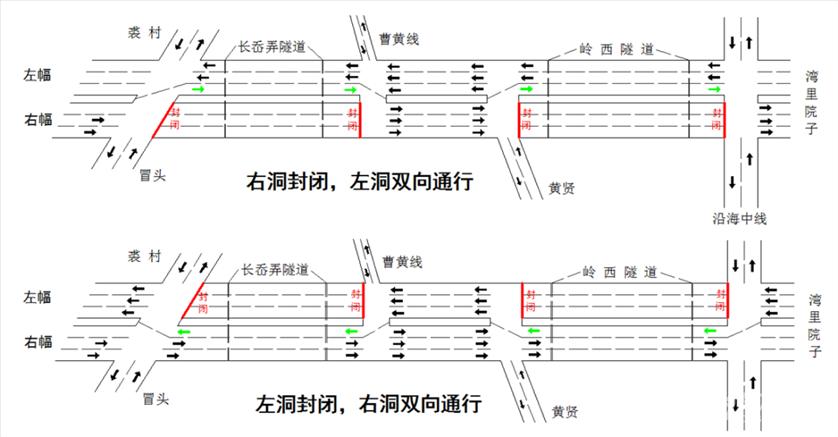 长岙弄隧道单洞、岭西隧道单洞进行临时封闭,车辆由另外单洞临时双向通行。