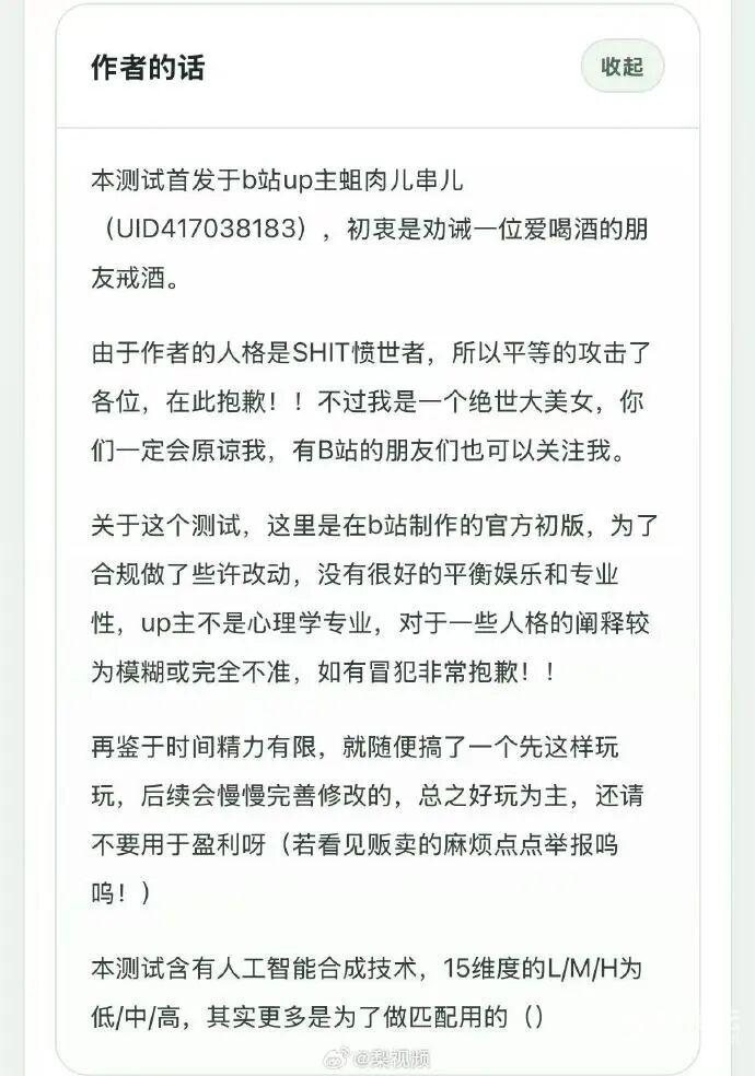 最近,SBTI人格测试在网络上迅速蹿红,成为社交平台上的热门话题,大量网友纷纷参与测试并在朋友圈分享结果,形成刷屏之势。 作者还提到由于难以平衡测试的娱乐性与专业性,部分人格阐释存在模糊不清或与常规理解不符的情况,若因此冒犯到网友深感抱歉。此外,鉴于时间精力有限,目前测试只是初步版本,后续会逐步完善修改,还特别强调此测试仅供娱乐,禁止用于商业盈利。 @密度新闻 查询作者在4月10日深夜发布了新链接称:新的链接来啦,按照建议做了略微修改,应该不会再崩了。 ![]() ![]() ![]() 据江南都市报此前报道,4月9日,一款玩梗版人格测试SBTI火爆全网。9日夜到10日凌晨,朋友圈被大量刷屏。 据了解,该测试以MBTI为灵感框架,因其内容具有荒诞性与网络传播度引发社交狂欢,但本质是纯娱乐产物,与MBTI的科学性存在根本差异。 ![]() ![]() 4月9日,SBTI测试冲上热搜,据了解,该测试以MBTI为框架推出荒诞的戏称,通过完成答题之后测出“尤物”、“吗喽”等抽象自嘲标签。该测试的界面也同样回应了MBTI,表示“MBTI已经过时,SBTI来了” 。 |