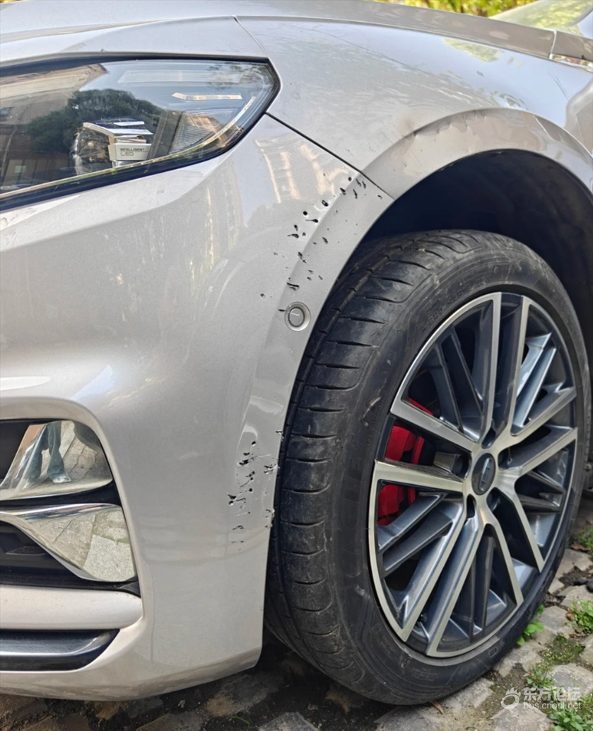 车停楼下,早上准备出门,凑近一看懵圈了,全是狗啃的印子!!车底下的内衬都咬掉了,上面还有白色狗毛!