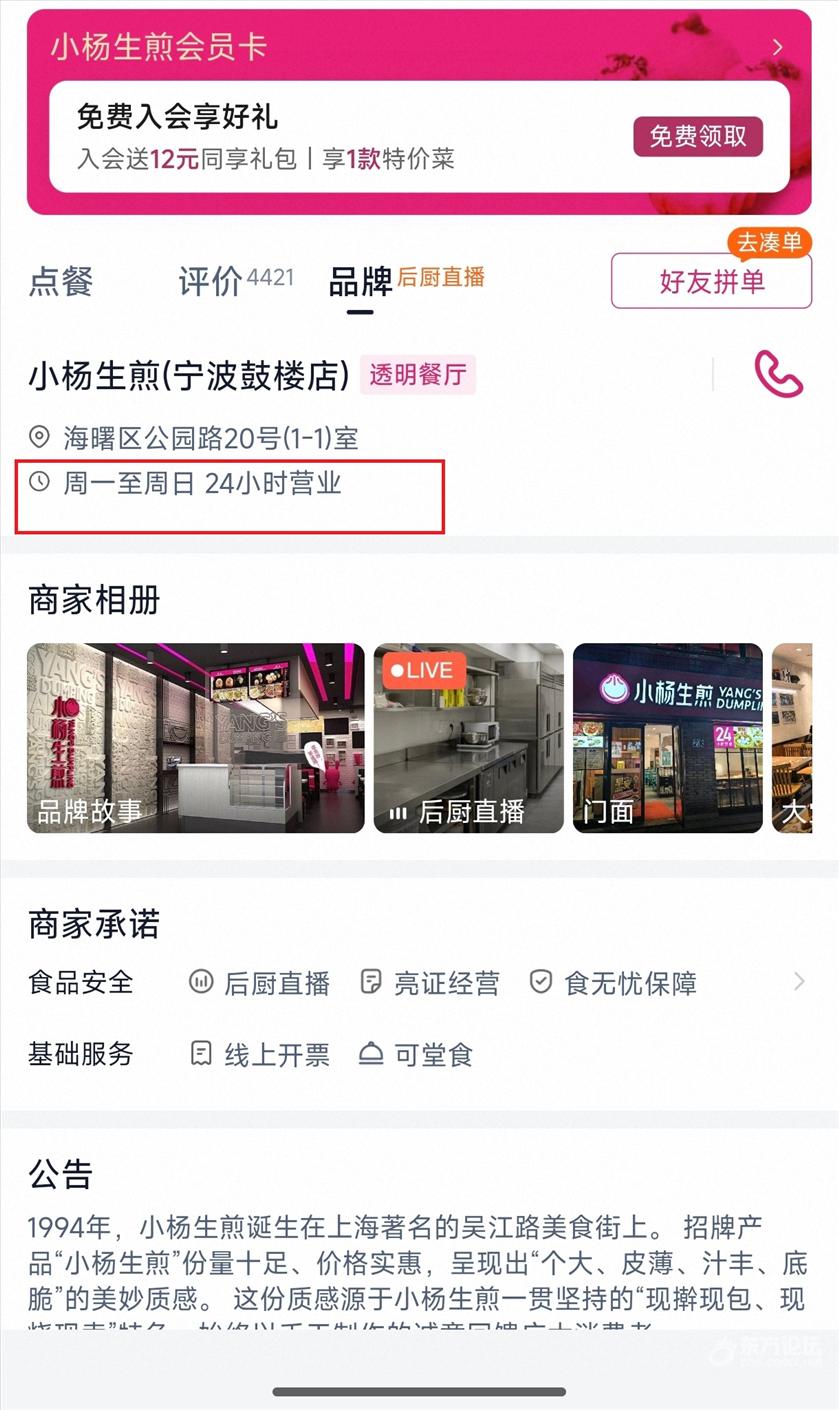 晚上点外卖,发现小杨生煎店铺还开着,点进店铺一看,发现鼓楼这家小杨生煎店铺竟然是24小时营业的,半夜真的会有人去吃小杨生煎吗?现在餐饮店怎么有这么多24小时店铺?