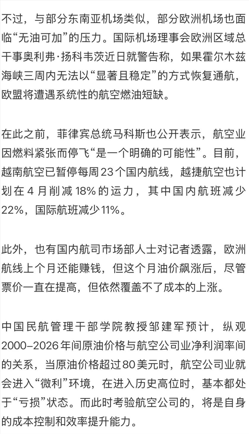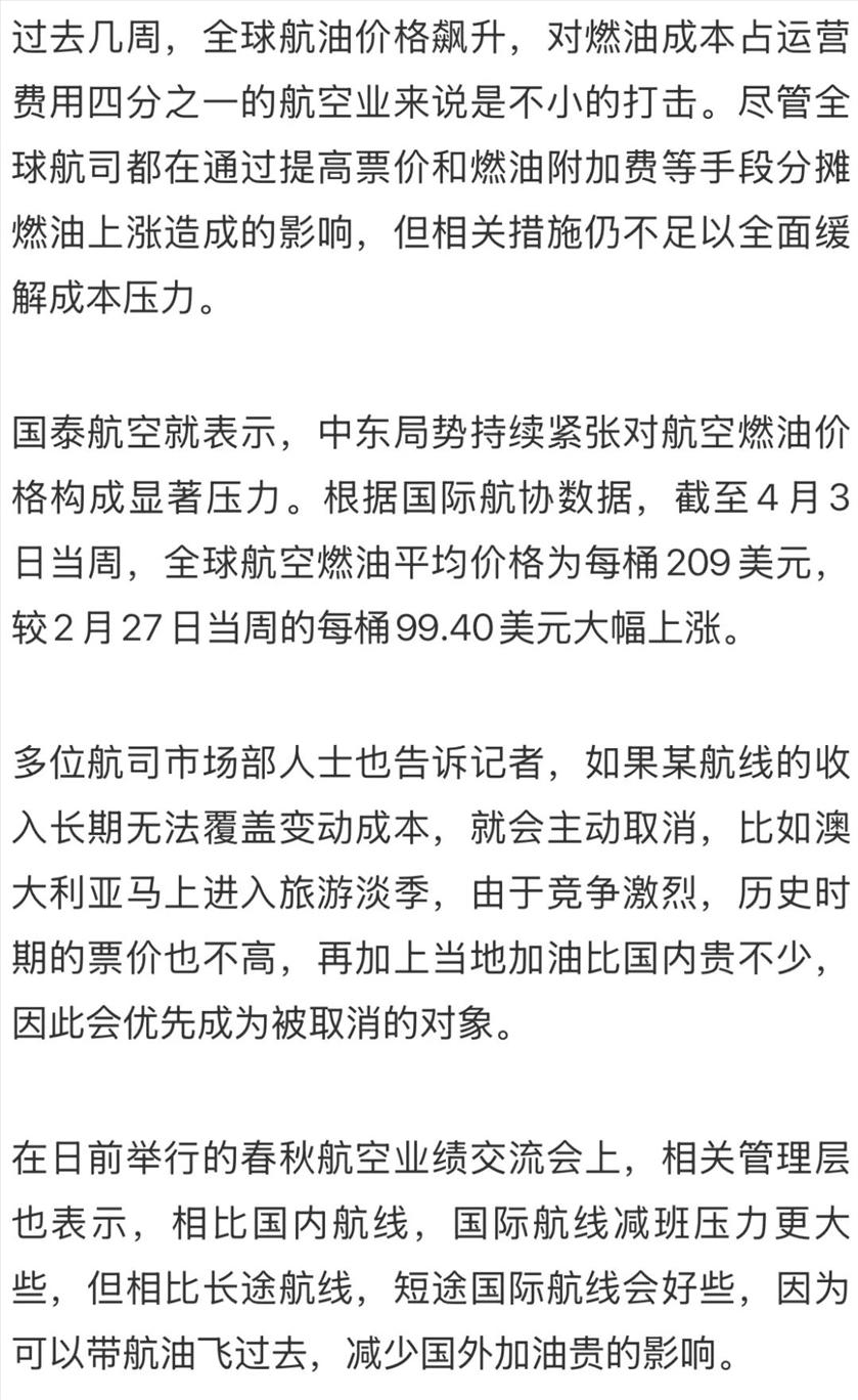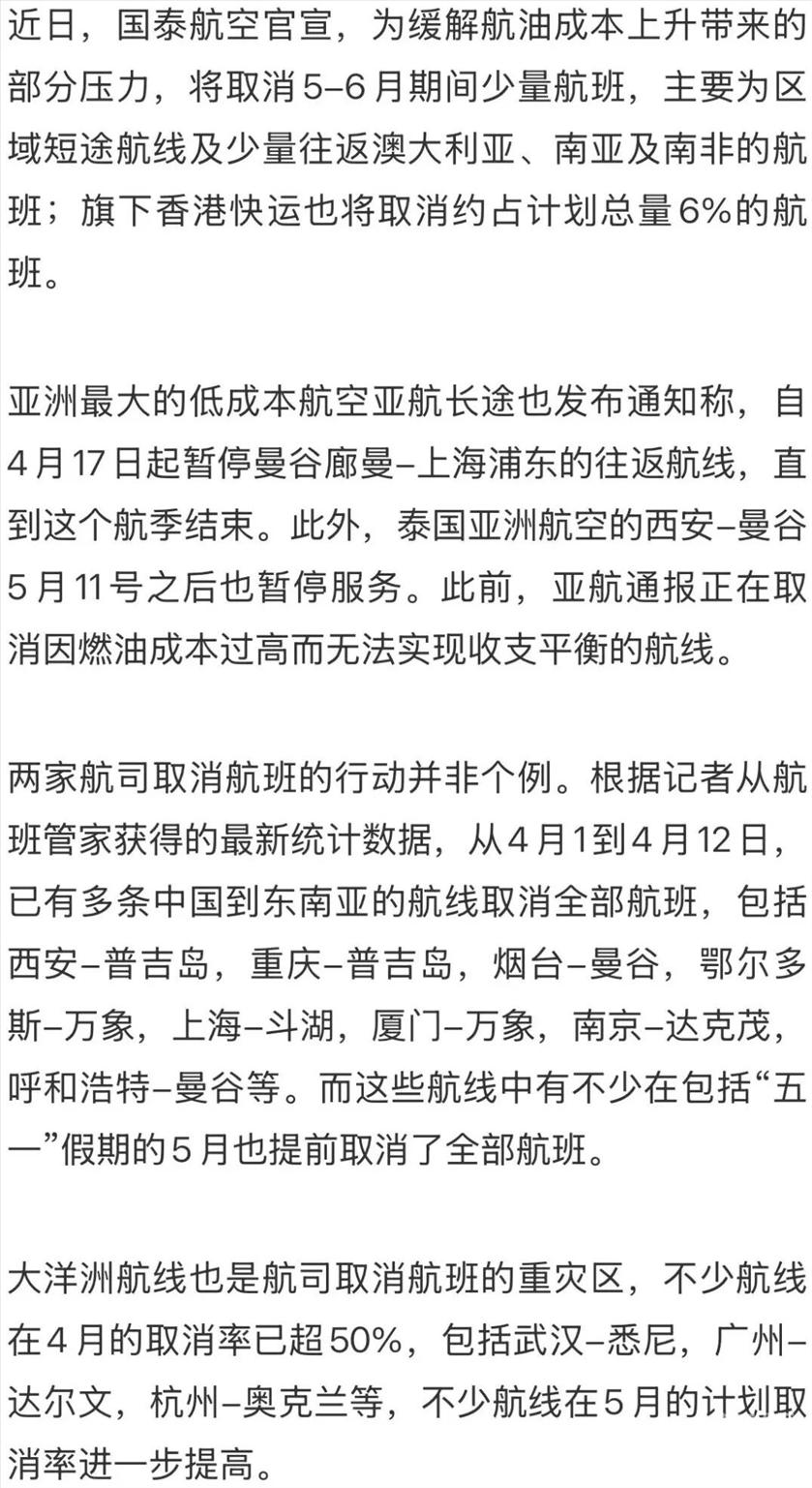 最近一段时间,不少网友在社交平台上,贴出了自己提前预订的“五一”假期机票被取消的截图,被取消的航班主要以飞东南亚和大洋洲居多。 第一财经记者从多家航空公司获悉,从4月开始主动取消的航班确实有所增加,其中东南亚和大洋洲是重头,这与油价的大幅上涨不无关系。相比国内,部分国际机场加油价格更高,叠加需求和竞争的影响,部分航线的取消就首当其冲。 而这样的情况,正在全球航线市场蔓延,也逐渐改变着航空业的竞争格局和旅客的出行选择。 ![]() 部分中国飞东南亚取消全部航班 ![]() ![]() 中国航司加码欧洲也有隐患 相比东南亚和大洋洲,欧洲航线目前成为国内航司加码的主战场。 由于中东地区受战争的影响航班量大减,大量原本通过中东中转去欧洲的旅客改为直飞,再加上中国航司可以通过俄罗斯领空飞欧洲,相比欧洲航司在飞行时间和成本方面都有优势,因此都在不断增开欧洲航线。 比如东航夏秋航季的欧洲航线周始发班次同比增长24%,旺季每周欧洲线最高能飞410班,同比增幅超35%;南航在换季第一天就新开北京大兴-赫尔辛基航线,后续还计划在广州-伦敦、广州-马德里、广州-莫斯科、广州-布达佩斯等多条欧洲航线增班;国航也将在夏秋航季新开北京大兴到法兰克福和米兰的新航线。 ![]() |