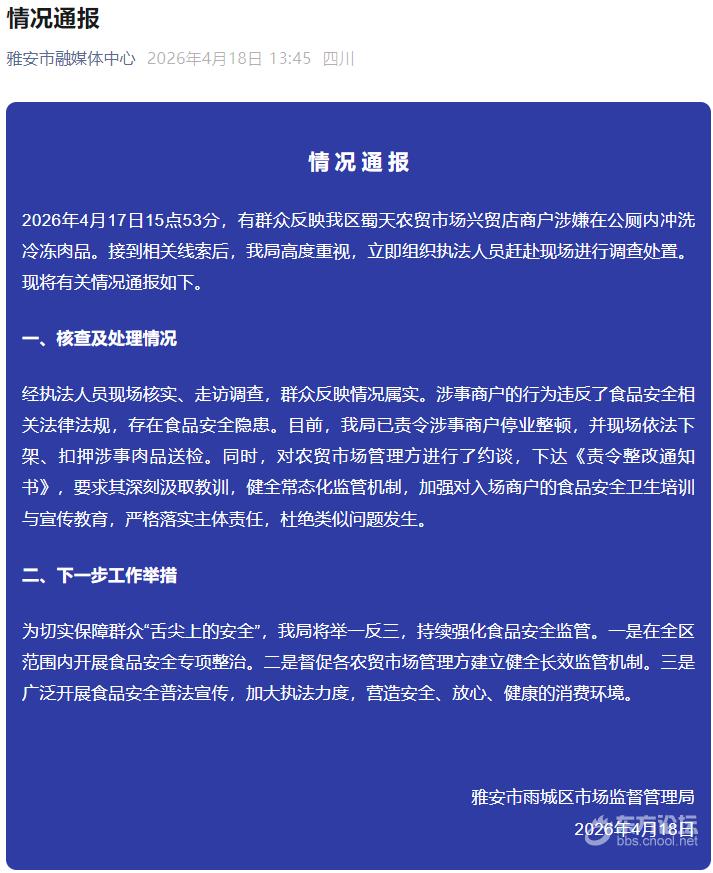 4月18日,四川省雅安市雨城区市场监督管理局发布情况通报。 4月17日15点53分,有群众反映蜀天农贸市场兴贸店商户涉嫌在公厕内冲洗冷冻肉品。接到相关线索后,该局高度重视,立即组织执法人员赶赴现场进行调查处置。 经执法人员现场核实、走访调查,群众反映情况属实。涉事商户的行为违反了食品安全相关法律法规,存在食品安全隐患。目前,该局已责令涉事商户停业整顿,并现场依法下架、扣押涉事肉品送检。同时,对农贸市场管理方进行了约谈,下达《责令整改通知书》,要求其深刻汲取教训,健全常态化监管机制,加强对入场商户的食品安全卫生培训与宣传教育,严格落实主体责任,杜绝类似问题发生。 为切实保障群众“舌尖上的安全”,该局将举一反三,持续强化食品安全监管。一是在全区范围内开展食品安全专项整治。二是督促各农贸市场管理方建立健全长效监管机制。三是广泛开展食品安全普法宣传,加大执法力度,营造安全、放心、健康的消费环境。 ![]() |