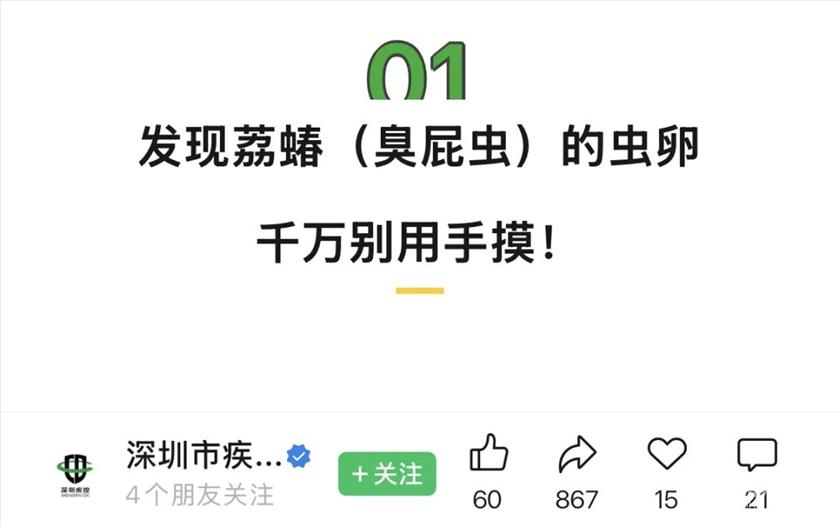 最近 在社交平台上 多位网友表示 “绿色小颗粒”又来了 ▼ ![]() ![]() 图源:网络 ![]() 图源:@GU 这些“绿色小颗粒”就是荔蝽(臭屁虫)的虫卵。 发现荔蝽(臭屁虫)的虫卵 千万别用手摸! 据“国家应急广播”科普,荔蝽(臭屁虫)主要分布在福建、江西、广东一带。 此前,健康杭州对此也曾发文提醒: ![]() ![]() 成虫产卵期从3月中旬持续至10月上旬,其中4、5月为产卵盛期。每头雌虫一生一般产卵5—10次,每次产卵14粒。 晾晒在阳台的衣物、毛巾质地柔软,潮湿度刚好,又带着淡淡芳香,便会吸引荔蝽在上面产卵。 单纯的虫卵,其实并不会对人造成什么伤害。在收衣服时如果发现虫卵,不要用手直接碰触,可以用刷子或牙签把粘住的虫卵刷掉,之后再将衣物重新清洗干净即可。 如果已经破壳 千万别用手接触 荔蝽(臭屁虫)在受到惊吓时,会分泌并喷射带有腐蚀性的臭液,这种恶臭气体或液体沾染植物、水果或叶片都会留下这种臭味,闻之令人作呕。 臭液本身还自带很强的腐蚀性,里面又含有组织胺等成分,沾上它的毒液,很容易把人“烧伤”: 毒液接触到皮肤,可引起刺痛、红肿、瘙痒等刺激性症状;不小心溅到眼睛更麻烦,存在角膜溃疡甚至失明的危险。可以用碱性肥皂清洗或者一天多次涂抹,可有效缓解症状,正常情况3-5天会慢慢痊愈;如果情况继续恶化或者直接喷到眼睛,请立即到医院就诊。 ![]() △深圳市疾控中心发文提醒:千万别用手摸臭屁虫的虫卵 不想被“喷”?做好这几件事 1、避免直接接触 发现虫卵,及时用刷子或牙签把虫卵处理掉。发现臭屁虫,可以用纸巾、手套保护拾起来丢掉,或者用瓶子给它装进去。 2、衣物别晾晒太久 晾晒在阳台的衣物、毛巾等质地柔软,潮湿度刚好,又带着淡淡芳香,容易吸引臭屁虫在上面产卵,所以干了就尽快收! 3、物理隔绝 纱窗和纱门可以有效地隔绝臭屁虫入侵室内。 4、关灯 臭屁虫特别喜欢光,所以平时阳台灯随开随关,晚上的时候记得拉上窗帘并关紧阳台门。 各位收衣服的时候 如果发现虫卵记得及时清理 可以用刷子或牙签 把黏在衣服的虫卵刷掉 之后再将衣服重新清洗干净 不要用手直接碰触 不要心软 果断把它们送得远远的! 转发出去 提醒更多人 |