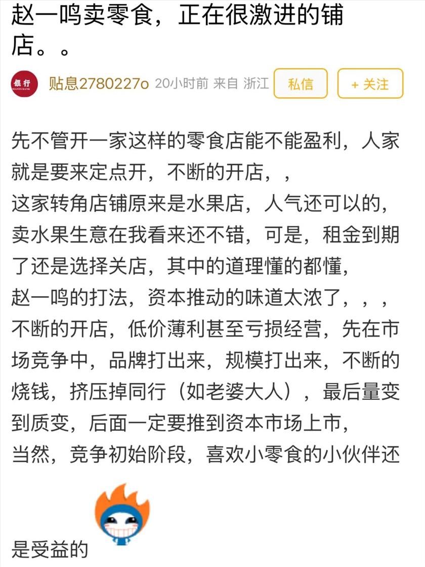 最近,你有没有发现,身边的“赵一鸣零食”突然像雨后春笋一样冒出来了?一条街上,左边是老婆大人,右边是赵一鸣,对面可能还开着零食很忙。尤其是赵一鸣,开店速度之快,让人眼花缭乱。这背后到底是生意红火,还是另有玄机? 日前,东论一位网友的帖子,直接揭开了这层窗户纸。事情的起因是这样的,该网友发现一个位置很好的转角店铺,原本是一家生意还不错的水果店。可租金到期后,水果店关门了。没过多久,一家赵一鸣零食就开了起来。这让他忍不住发帖分析: ![]() ![]() ![]() 这段话一出,评论区直接炸了。大家纷纷发表了自己的看法。有网友把这种模式和新能源汽车行业做了类比: ![]() 有网友直言:现在多猖狂,以后就会多惨~ ![]() 还有网友直接点出核心风险: ![]() 甚至还有网友从社会层面提出了尖锐批评: ![]() 总结下来,这些网友觉得赵一鸣疯狂开店不是为了赚钱,而是为了做数据、讲故事、上市套现。一旦资本撤退,就是一地鸡毛。 另外一些网友则表示,作为消费者,只关心价格。只要不充值、不办卡、不加盟,不承担风险,那趁机薅点羊毛又何乐而不为?管他烧谁的钱。 ![]() ![]() ![]() 也有网友看得更透彻,指出了这种模式真正的“猎物”——是收割加盟商和投资人。 ![]() ![]() 据查询,鸣鸣很忙集团(赵一鸣 + 零食很忙),如今全国门店已超2 万家,今年 1 月已在港交所上市,市值一度突破900 亿港元,是实打实的 “港股量贩零食第一股”。 赵一鸣们的快速扩张,其实是过去几年消费投资热潮的一个缩影。 对于我们普通消费者而言,大家该买就买,享受这波红利。但别充值,因为你不知道这家店明年还在不在。另外,想加盟的,千万慎重,别被“品牌方”画的饼冲昏头。 资本的游戏,普通人往往只能看到热闹的前半场。至于后半场是“上市敲钟”还是“关店跑路”,只有时间能给出答案。在那之前,作为消费者,咱们就记住一句话:便宜可以占,但别上头。 你身边有赵一鸣或者类似的零食店吗? 你是觉得便宜真香,还是担心资本割韭菜? 欢迎留言讨论 |