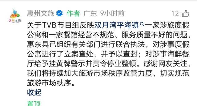 此外,节目还测评了一家网上评价高、价格低的海景公寓,但主持人在联络入住时却遇到沟通不畅、临时加价等问题。 进入房间后,虽然节目组确实看到海景,但房间内床铺没收拾好、厕所灯光昏暗,开了热水后还有浓烈的煤气味。最终节目组决定退房离开。 ![]() ![]() 4月21日,惠州文旅在视频号评论区回应事件: 关于TVB节目组反映双月湾平海镇一家涉旅度假公寓和一家餐馆经营不规范、服务质量不好的问题,惠东县已组织有关部门进行联合执法,对涉事度假公寓进行了立案查处,并予以查封;对涉事海鲜餐厅给予挂黄牌警示并责令停业整顿。感谢网友关注,我们将持续加大旅游市场秩序监管力度,切实规范旅游市场秩序。 ![]() |