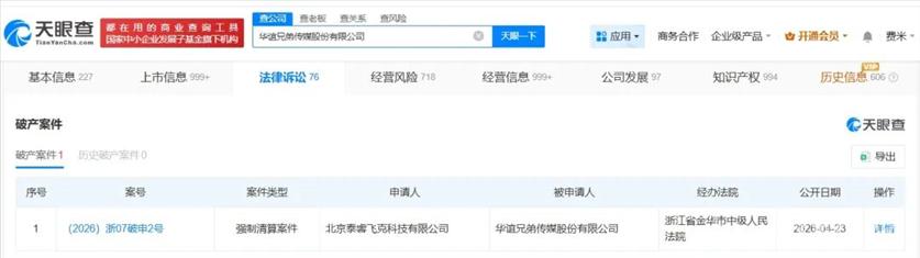 8年亏了85亿的华谊兄弟被正式申请破产,相关话题冲上热搜第一。 ![]() 天眼查法律诉讼信息显示,华谊兄弟传媒股份有限公司(300027.SZ)新增一则破产案件,破产申请人为北京泰睿飞克科技有限公司(下称“泰睿飞克”),破产被申请人为华谊兄弟传媒,经办法院为浙江省金华市中级人民法院,案件类型为强制清算案,案号(2026)浙07破申2号。案件的公开日期为2026年4月23日。 ![]() 这也意味着,此案预重整已经获得法院受理,将正式进入破产审查程序。 此前于4月15日,华谊兄弟传媒股份有限公司(华谊兄弟,300027.SZ)公告称,当日,公司收到债权人北京泰睿飞克科技有限公司(以下简称“申请人”)发来的《告知函》,申请人以公司不能清偿到期债务且明显缺乏清偿能力,但具备重整价值为由,向浙江省金华市中级人民法院申请依法裁定对公司进行重整,并申请对公司进行预重整。 公告显示,截至《告知函》出具日,华谊兄弟对申请人负有到期债务本金1140.5155万元未予支付。 ![]() 图片来源:界面新闻 华谊兄弟在公告中表示,截至本公告披露日,公司尚未收到金华中院受理预重整申请的文件,申请人的预重整申请能否被法院裁定受理,公司后续是否进入预重整或重整程序均存在重大不确定性。无论公司是否进入预重整或重整程序,公司将在现有基础上积极做好日常生产经营管理工作。后续若收到金华中院受理预重整或受理重整申请的文件,公司将及时履行信息披露义务。 根据公告,如果法院正式受理申请人对华谊兄弟的预重整申请,后续公司进入重整程序且重整顺利实施完毕,将有利于改善公司经营和财务状况,提升经营能力,优化公司资产负债结构。若重整失败,公司将存在被宣告破产的风险。如果公司被宣告破产,根据相关规定,公司股票将面临被终止上市的风险。 自2018年首次出现年度亏损以来,华谊兄弟已连续多年深陷亏损泥潭,截至2024年底公司已经连续亏损7年,合计亏损达82.5亿元。最新业绩预告显示,2025年公司预亏2.89亿至4.07亿元。以此计算,从2018年至2025年,这8年间,华谊兄弟至少亏损了85亿元。 华谊兄弟2025年年度报告预计4月29日披露。 此外,王忠磊所持股票正在被司法拍卖。4月3日,华谊兄弟公告,控股股东、实际控制人王忠磊持有的公司1130万股股票拟被司法拍卖,占其所持有公司股份总数的17.10%,占公司总股本的 0.41%。若上述股份拍卖成功,公司实际控制人及其一致行动人合计持股占公司总股本的7.86%,仍是公司第一大股东。截至公告披露日,公司实际控制人累计被冻结的股份数量占其所持公司股份数量比例超过80%。 华谊兄弟今年以来的股价持续走低。相较于2015年32.13元的历史峰值,目前华谊兄弟的股价已经缩水超过90%。 截至4月23日收盘,华谊兄弟的股价为1.97元/股,市值为54.7亿元。 欢迎在留言区分享 |