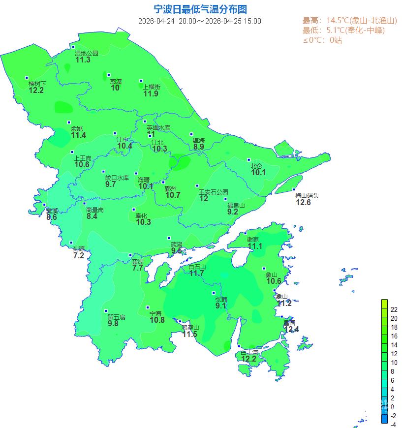 2026年4月24日20时至25日15时,宁波全市代表站气温最低为镇海站8.9℃。
