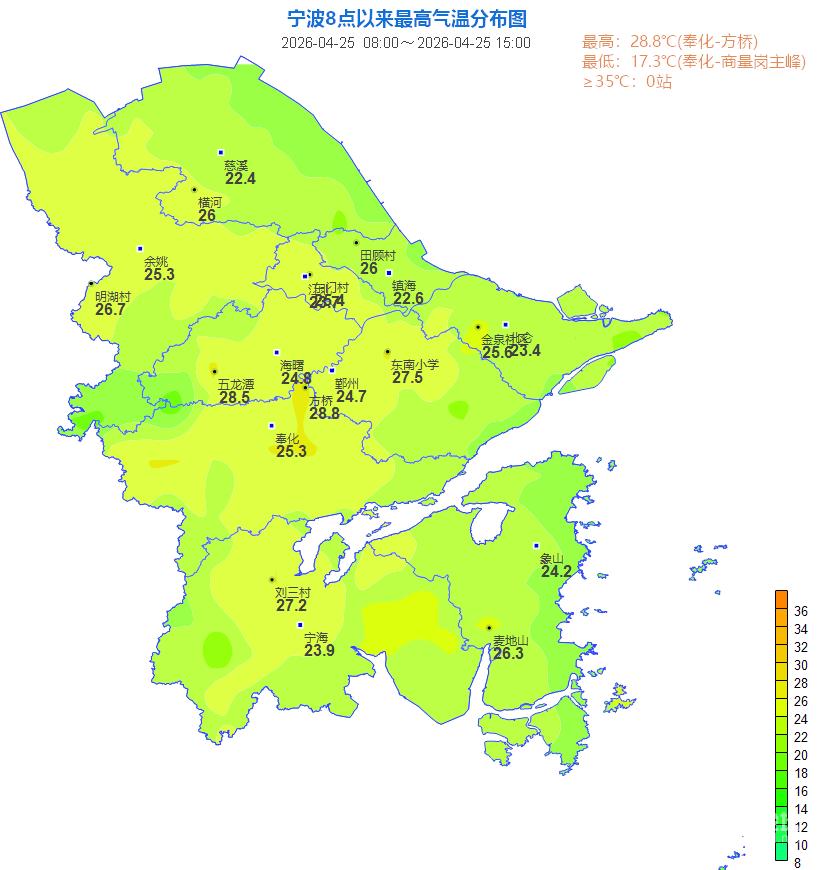 2026年4月25日8时至15时,宁波全市代表站气温最高为奉化和余姚站,均为25.3℃。