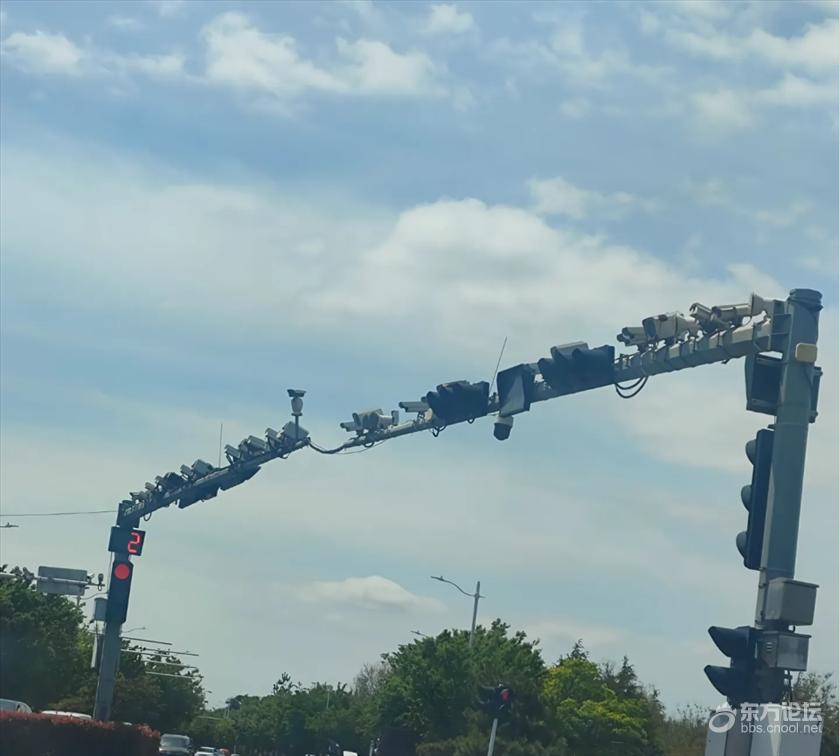 近日,有网友称,在青岛市城阳区一处路口,两根横杆上装了至少十几个摄像头。
