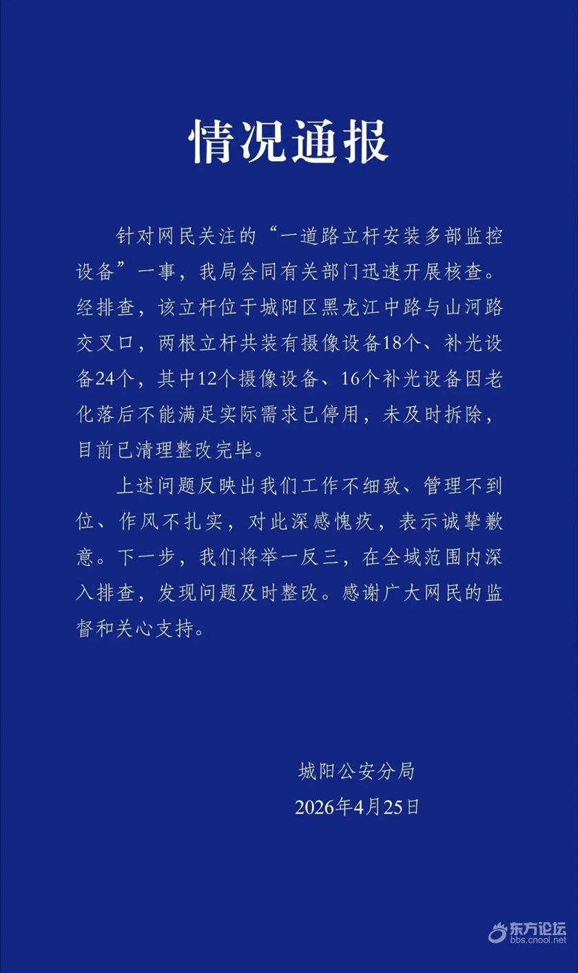 4月25日下午,城阳公安分局发布情况通报称,该处共装有摄像设备18个、补光设备24个,其中12个摄像设备、16个补光设备已停用,目前已清理整改完毕。“对此深感愧疚,表示诚挚歉意。”该局表示,将在全域范围内深入排查。