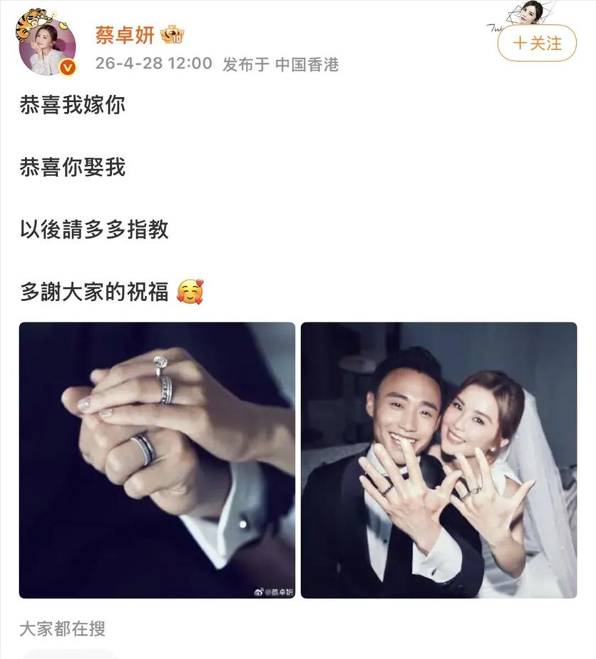 刚刚,女星蔡卓妍发微博,官宣结婚喜讯:
